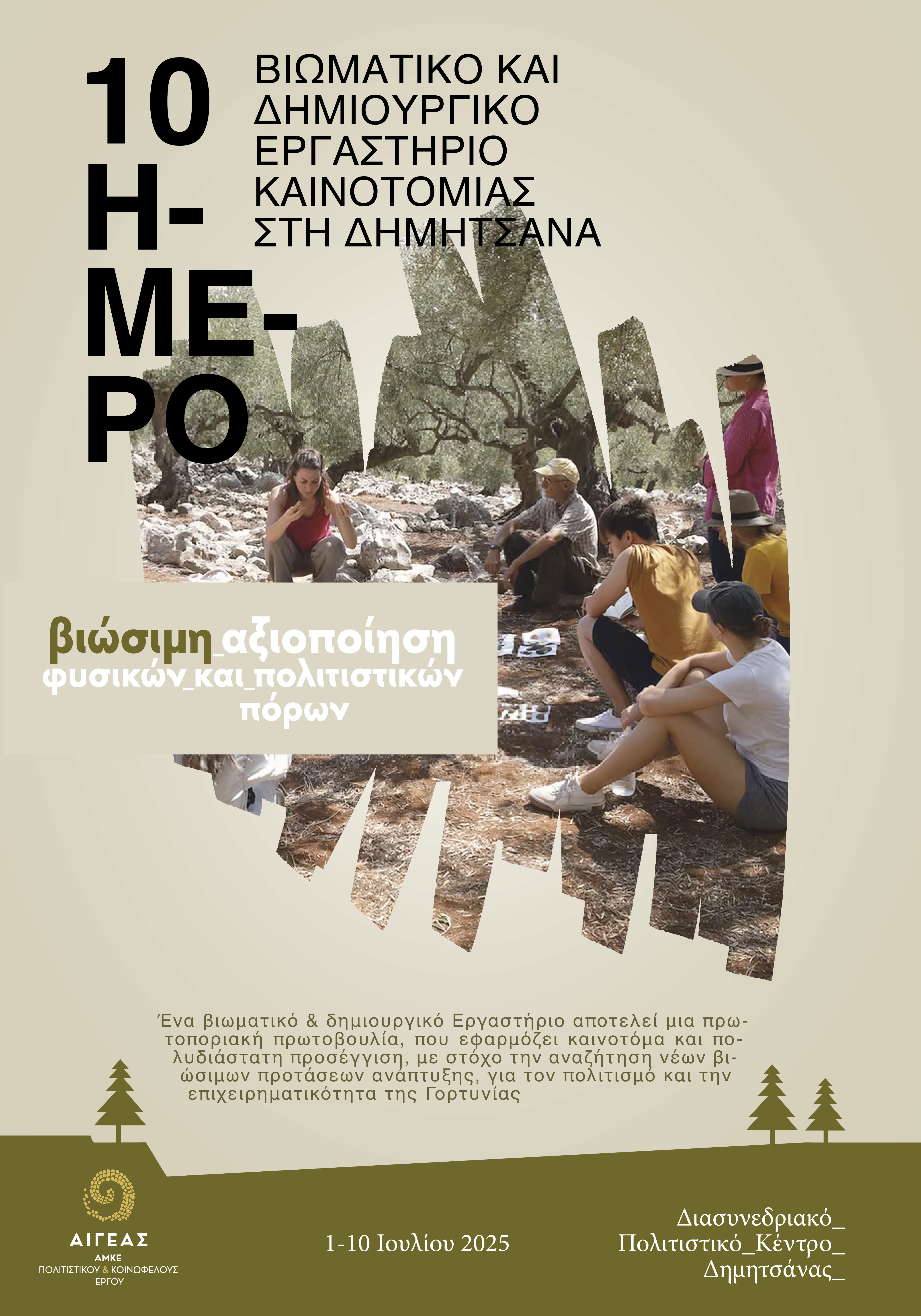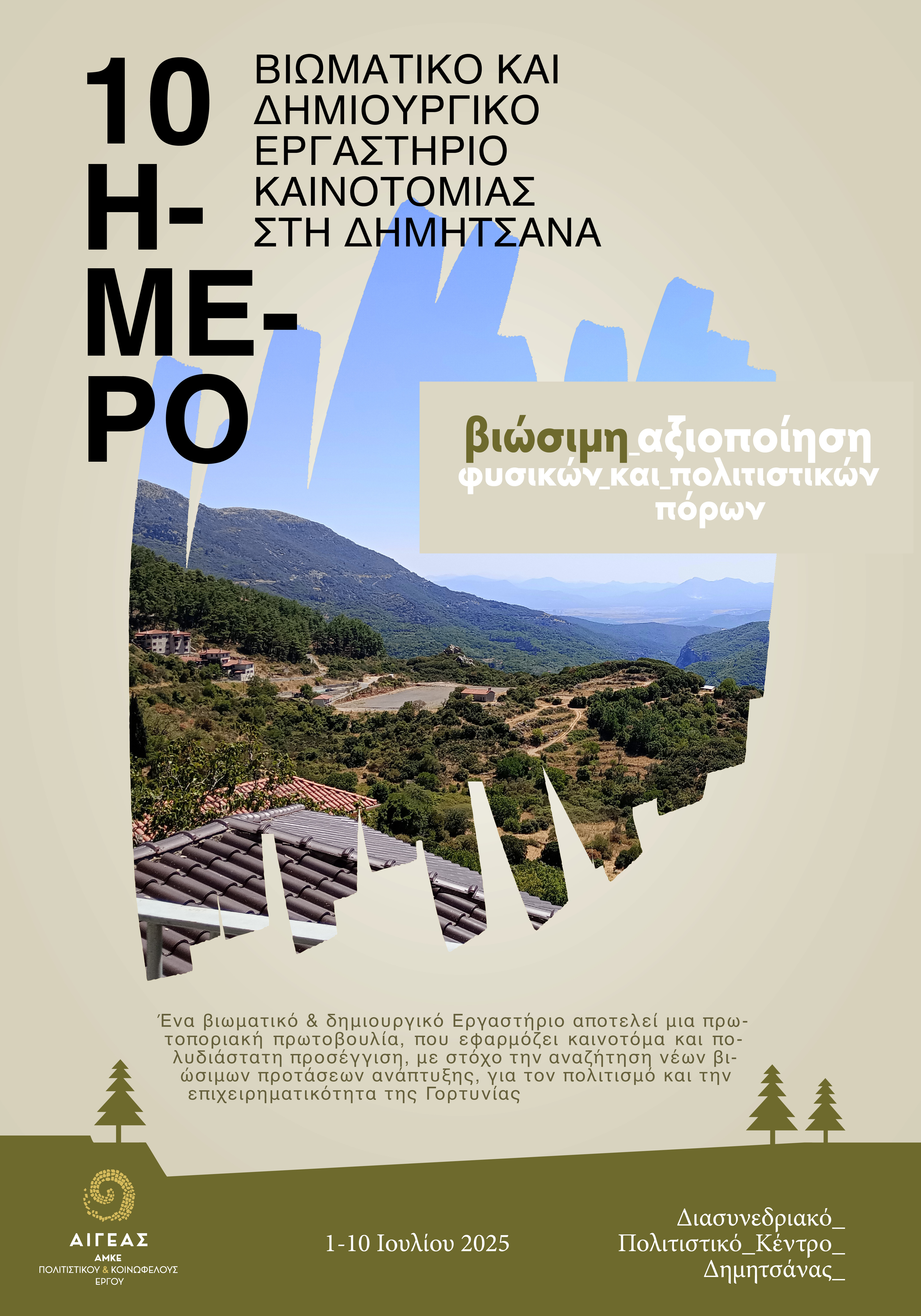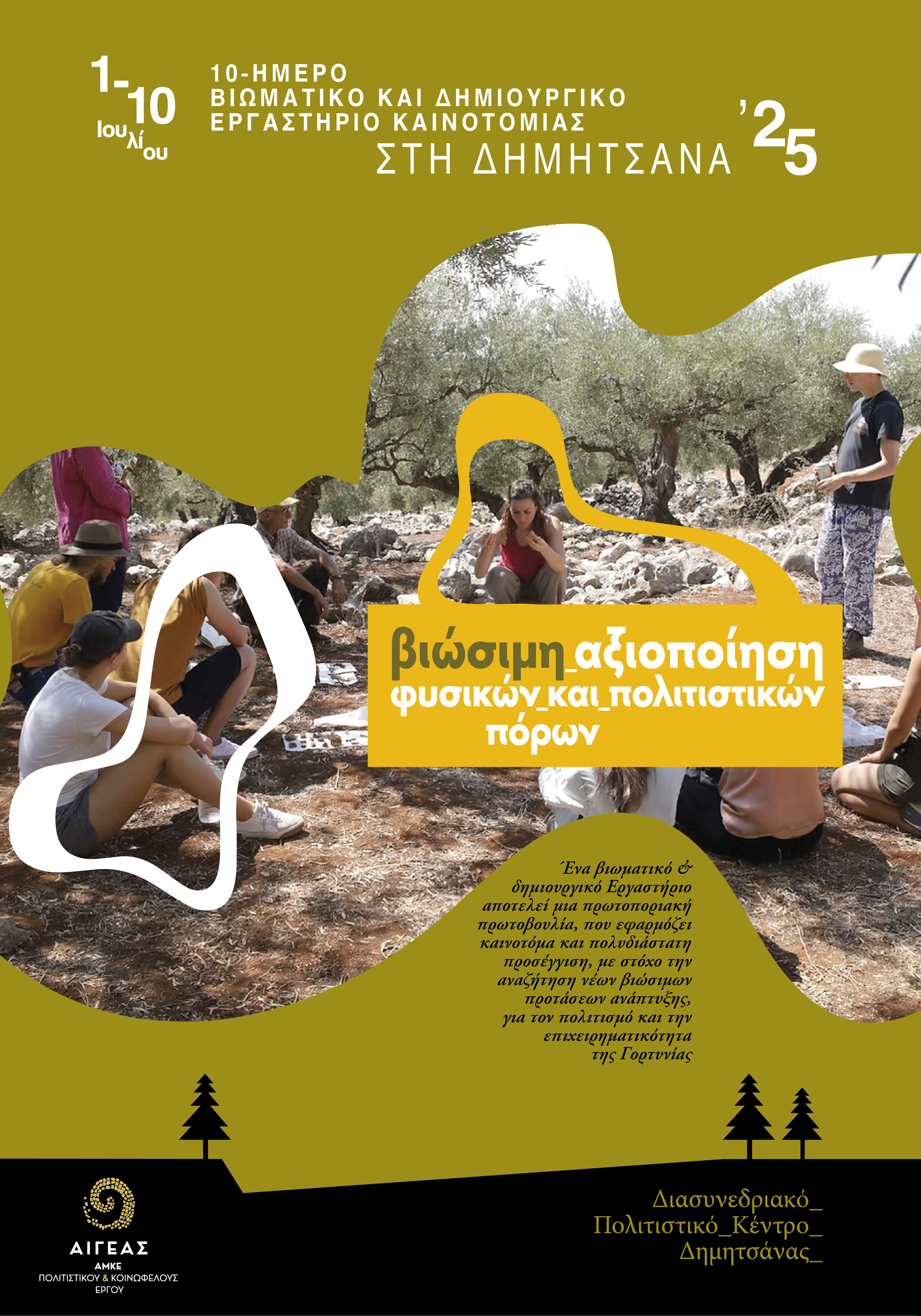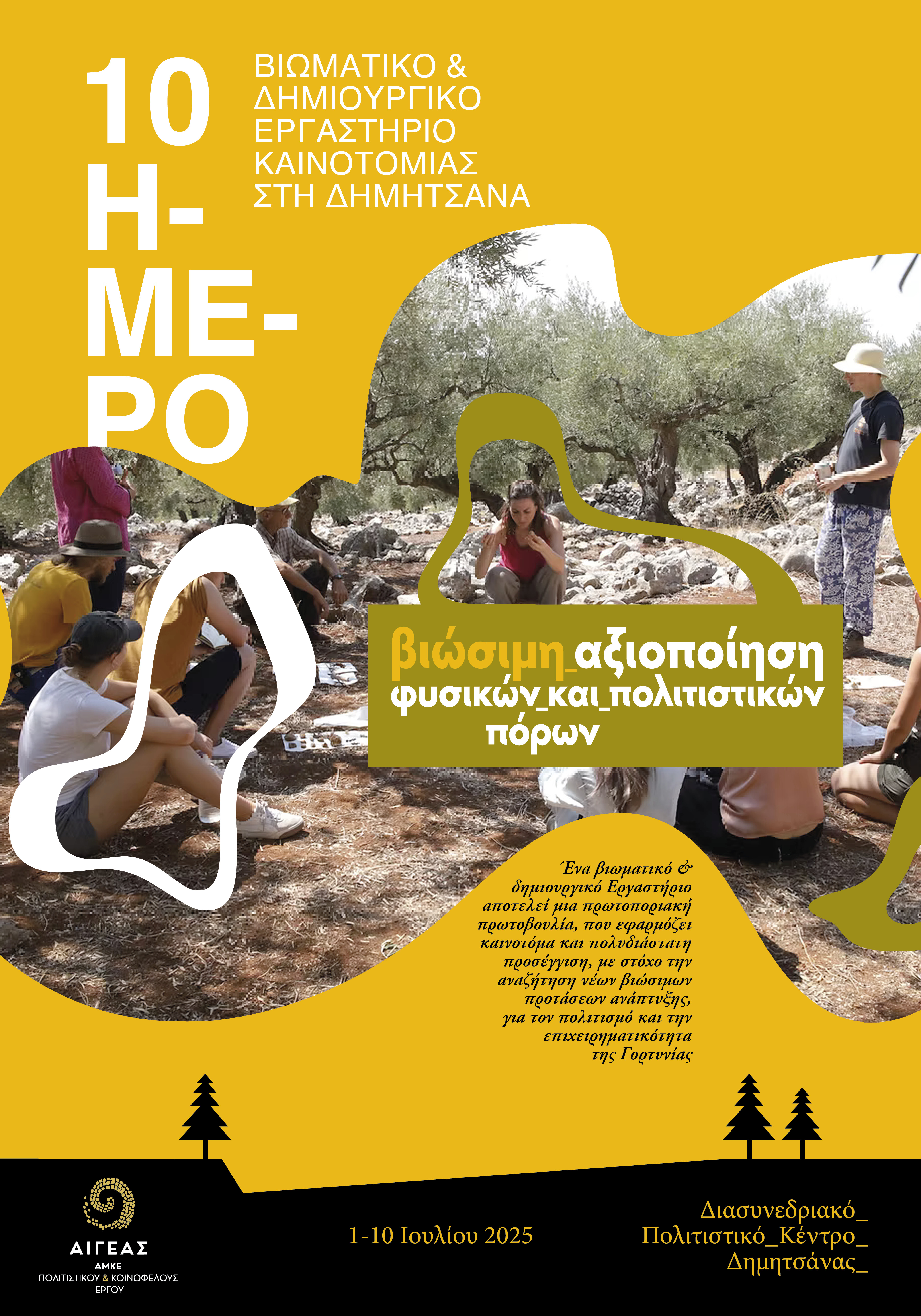 Διεθνές ερευνητικό εργαστήριο design και καινοτομικής κυκλικής οικονομίας - αειφορίας, σε συνέργεια με παράλληλη δημιουργική επαναξιοποίηση του τοπικού λαογραφικού πολιτισμού της Αρκαδίας θα γίνει στο Διασυνεδριακό κέντρο Δημητσάνας, από 1 έως 10 Ιουλίου 2025.