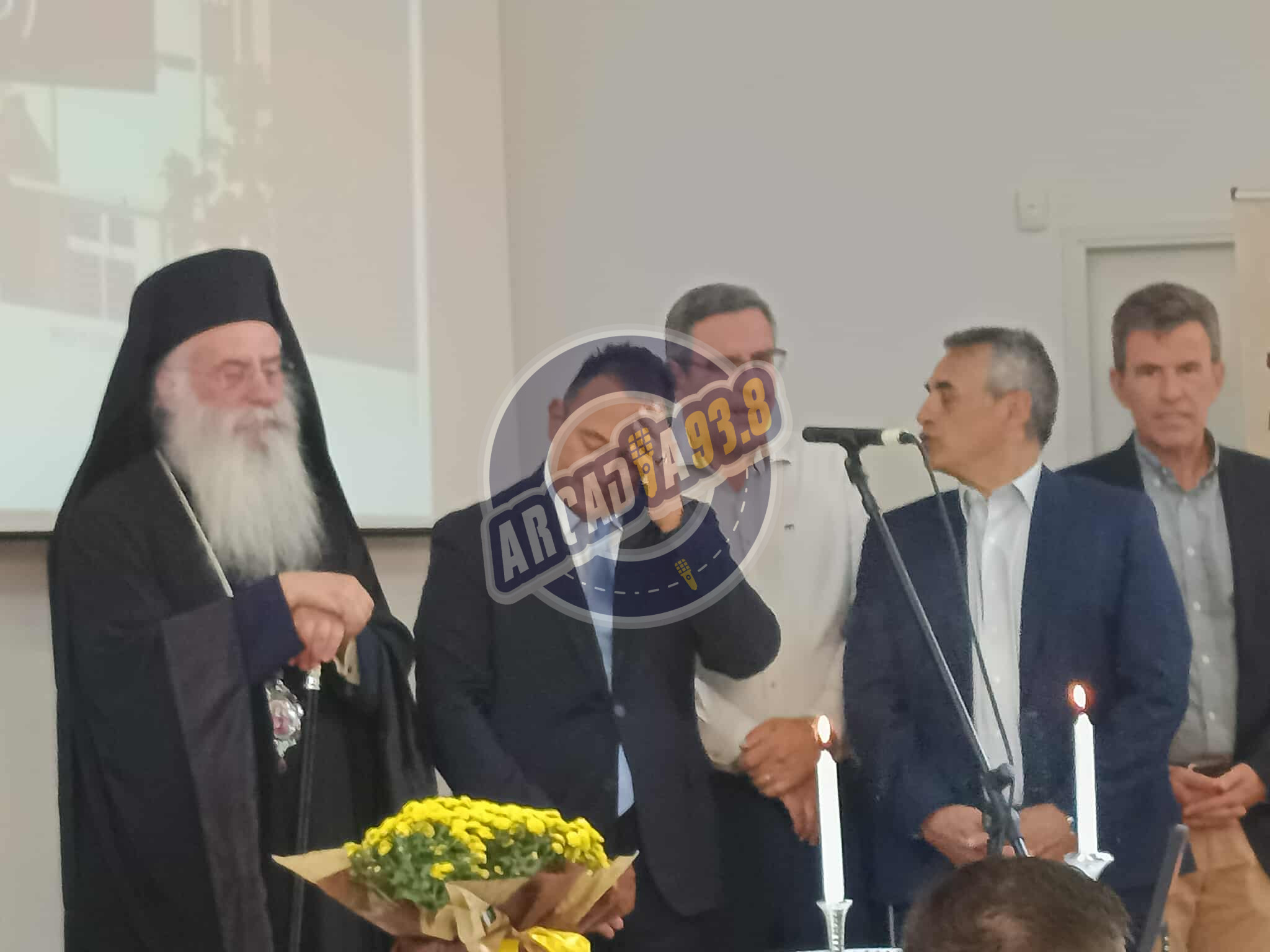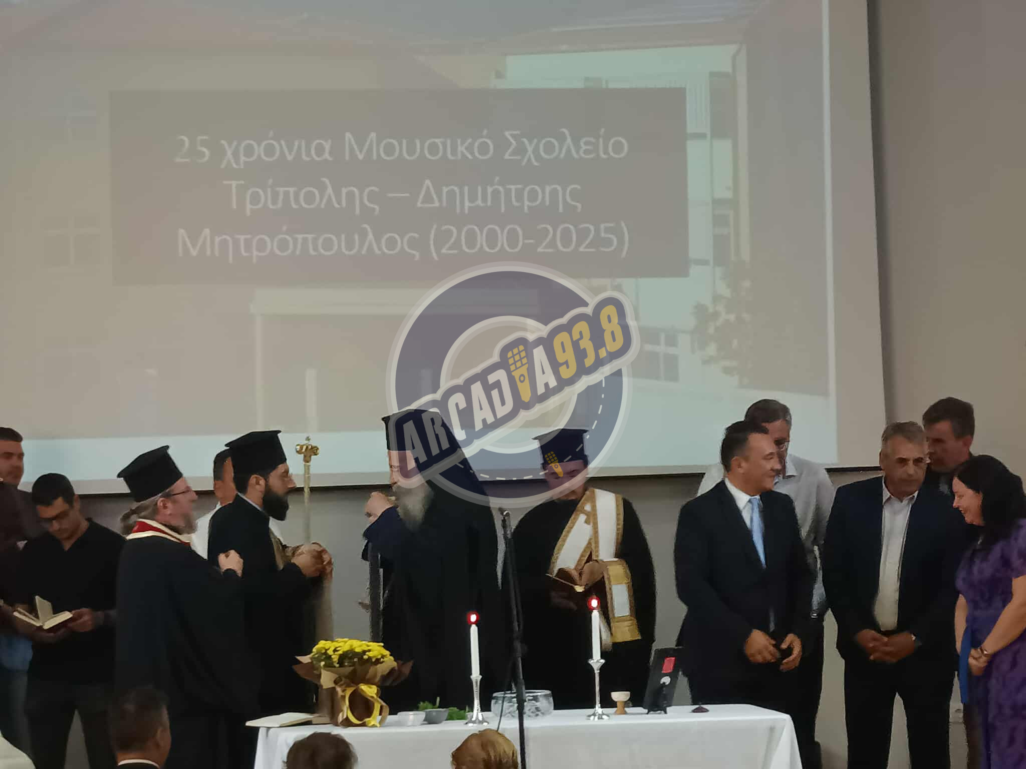 Της τελετής χοροστάτησε όπως και σ΄αυτή νωρίτερα στο 1ο Γυμνάσιο και Λύκειο Τρίπολης, ο Σεβ. Μητροπολίτης Μαντινείας και Κυνουρίας κ. Επιφάνιος ο οποίος ανακοίνωσε την δωρεά 5 υποτροφιών σε μαθητές και μαθήτριες του Μουσικού Σχολείου που θ' αριστεύσουν στις επερχόμενες Πανελλαδικές Εξετάσεις.