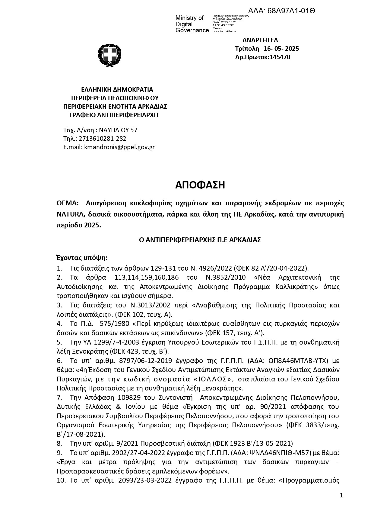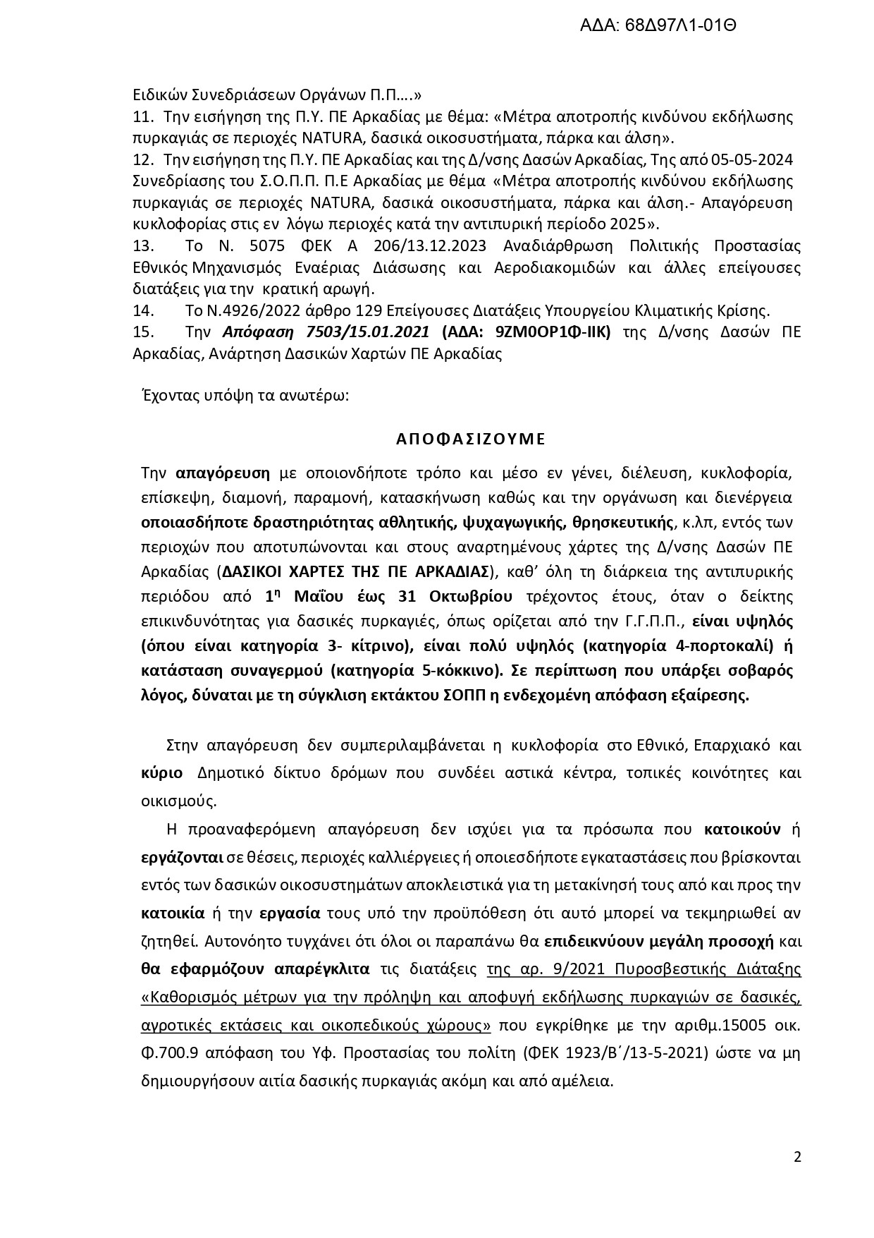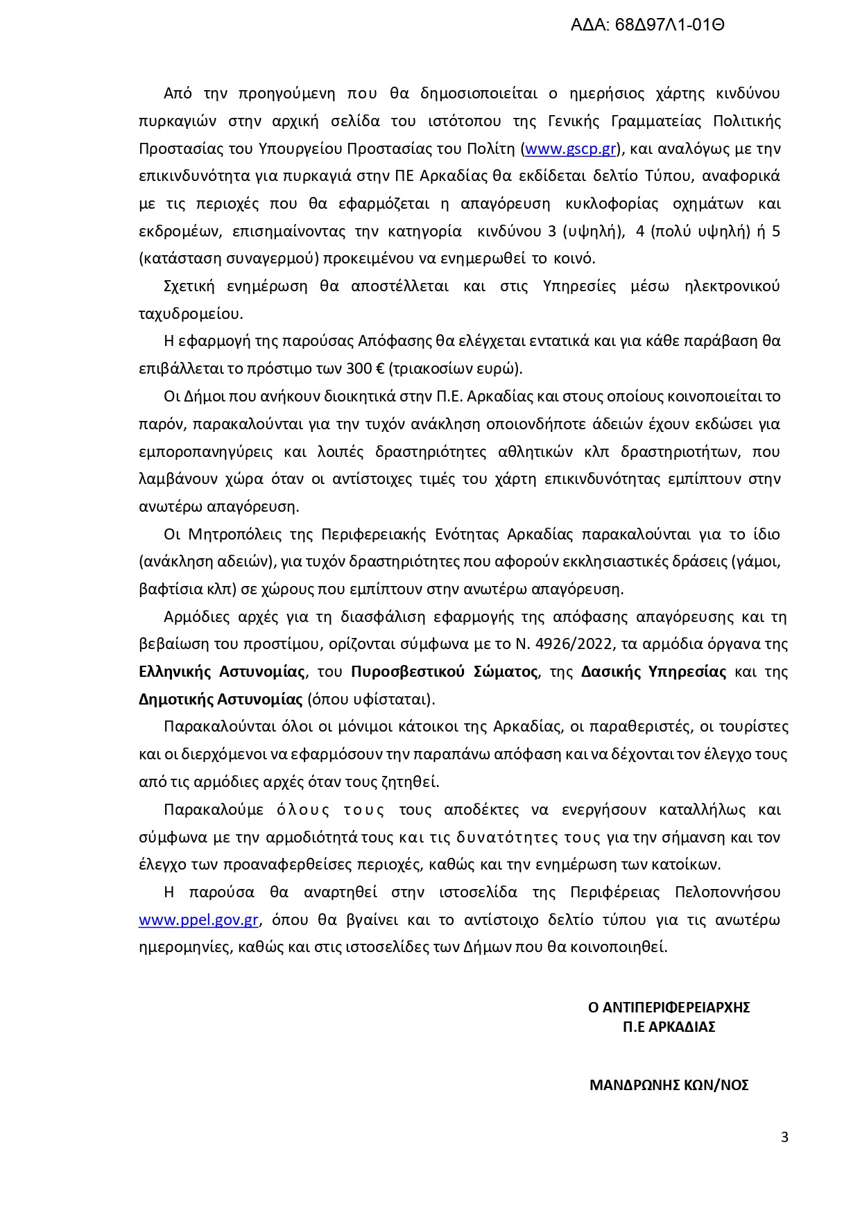 Με απόφαση που υπογράφει ο αντιπεριφερειάρχης Αρκαδίας, Κωνσταντίνου Μανδρώνη, απαγορεύεται με οποιονδήποτε τρόπο και μέσο εν γένει, διέλευση, κυκλοφορία, επίσκεψη, διαμονή, παραμονή, κατασκήνωση καθώς και την οργάνωση και διενέργεια οποιασδήποτε δραστηριότητας αθλητικής, ψυχαγωγικής, θρησκευτικής, κ.λπ, εντός των περιοχών που αποτυπώνονται και στους αναρτημένους χάρτες της Δ/νσης Δασών ΠΕ Αρκαδίας (ΔΑΣΙΚΟΙ ΧΑΡΤΕΣ ΤΗΣ ΠΕ ΑΡΚΑΔΙΑΣ), καθ’ όλη τη διάρκεια της αντιπυρικής περιόδου από 1η Μαΐου έως 31 Οκτωβρίου τρέχοντος έτους, όταν ο δείκτης επικινδυνότητας για δασικές πυρκαγιές, όπως ορίζεται από την Γ.Γ.Π.Π., είναι υψηλός (όπου είναι κατηγορία 3- κίτρινο), είναι πολύ υψηλός (κατηγορία 4-πορτοκαλί) ή κατάσταση συναγερμού (κατηγορία 5-κόκκινο).