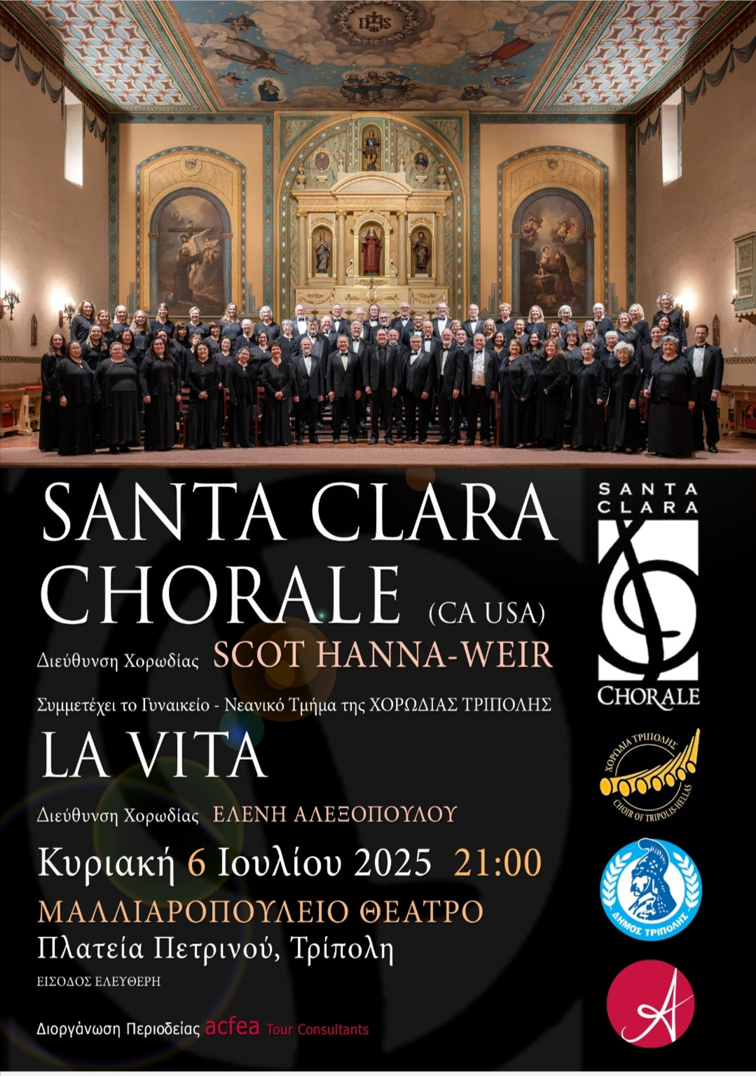 Η ΧΟΡΩΔΙΑ ΤΡΙΠΟΛΗΣ, πιστή στις επιλογές της για ποιοτικό πολυφωνικό τραγούδι, παρουσιάζει σήμερα τη φημισμένη 60μελή χορωδία SANTA CLARA από την Αμερική. Στο πλαίσιο της καλοκαιρινής της περιοδείας, η SANTA CLARA CHORALE επέλεξε την Τρίπολη και συγκεκριμένα τη ΧΟΡΩΔΙΑ ΤΡΙΠΟΛΗΣ για να δώσει μία εκ των τεσσάρων συναυλιών της στην Ελλάδα την Κυριακή, 6 Ιουλίου, στις 9 το βράδυ στο Μαλλιαροπούλειο Θέατρο.