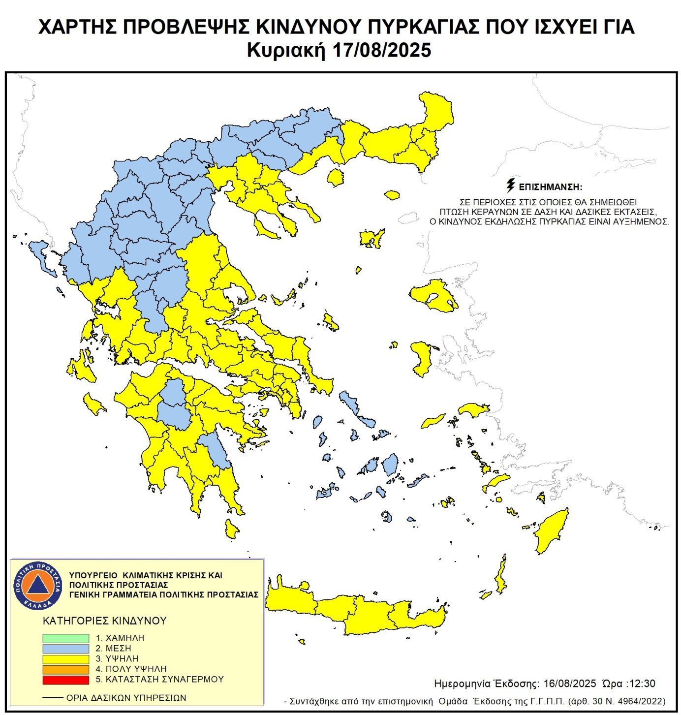 Υψηλός παραμένει ο κίνδυνος πυρκαγιάς (κατηγορία 3), την Κυριακή (17-08-2025) στη Γορτυνία, σύμφωνα με το Χάρτη Πρόβλεψης Κινδύνου Πυρκαγιάς που εκδίδει η Γενική Γραμματεία Πολιτικής Προστασίας του Υπουργείου Κλιματικής Κρίσης & Πολιτικής Προστασίας (civilprotection.gov.gr).