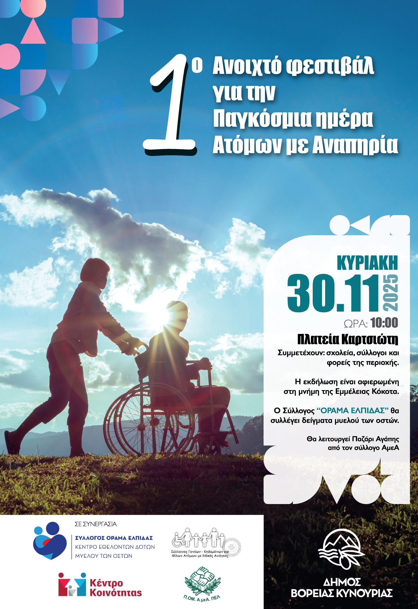 Ο Σύλλογος Γονέων – Κηδεμόνων και Φίλων Ατόμων με Ειδικές Ανάγκες διοργανώνει το 1ο Ανοιχτό Φεστιβάλ για την Παγκόσμια Ημέρα Ατόμων με Αναπηρία σε συνεργασία με τον Δήμο Βόρειας Κυνουρίας, τον Σύλλογο “ΟΡΑΜΑ ΕΛΠΙΔΑΣ” – Κέντρο Εθελοντών Δοτών Μυελού των Οστών, το Κέντρο Κοινότητας Δήμου Βόρειας Κυνουρίας, καθώς και την Π.Ο.Μ. ΑμεΑ Πελοποννήσου.