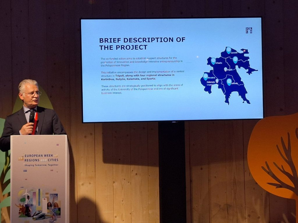 Με μια ομιλία ουσίας και ευρωπαϊκής προοπτικής, ο Περιφερειάρχης Πελοποννήσου Δημήτρης Πτωχός παρουσίασε στις Βρυξέλλες, στο πλαίσιο της Ευρωπαϊκής Εβδομάδας Περιφερειών και Πόλεων 2025, το εμβληματικό έργο «Ανάπτυξη Δομών Υποστήριξης της Καινοτομίας και της Επιχειρηματικότητας στην Περιφέρεια Πελοποννήσου».