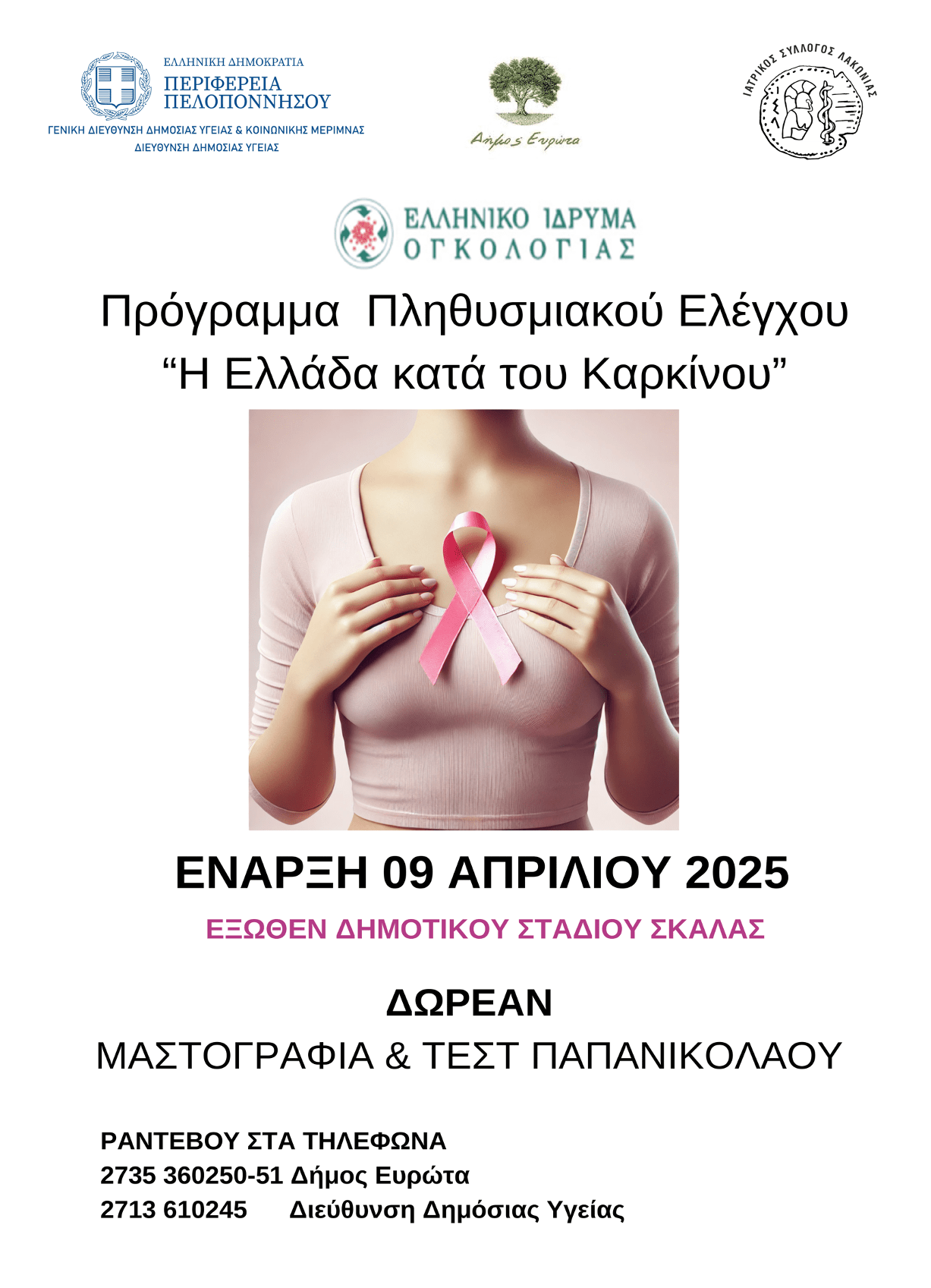 Με μεγάλη επιτυχία ξεκίνησε την Τετάρτη 09/04/2025 το πρόγραμμα πληθυσμιακού ελέγχου «Η ΕΛΛΑΔΑ ΚΑΤΑ ΤΟΥ ΚΑΡΚΙΝΟΥ», που πραγματοποιεί το Ελληνικό Ίδρυμα Ογκολογίας σε συνεργασία με την Περιφέρεια Πελοποννήσου για την πρόληψη και την έγκαιρη διάγνωση του καρκίνου του μαστού και του τραχήλου της μήτρας. Το πρόγραμμα υλοποιείται υπό την αιγίδα της Περιφέρειας Πελοποννήσου, το συντονισμό της Διεύθυνσης Δημόσιας Υγείας και σε αγαστή συνεργασία με το Δήμο Ευρώτα και παρέχει στις γυναίκες που κατοικούν στον Δήμο Ευρώτα δωρεάν εξέταση Μαστογραφίας και Τεστ Παπανικολάου.