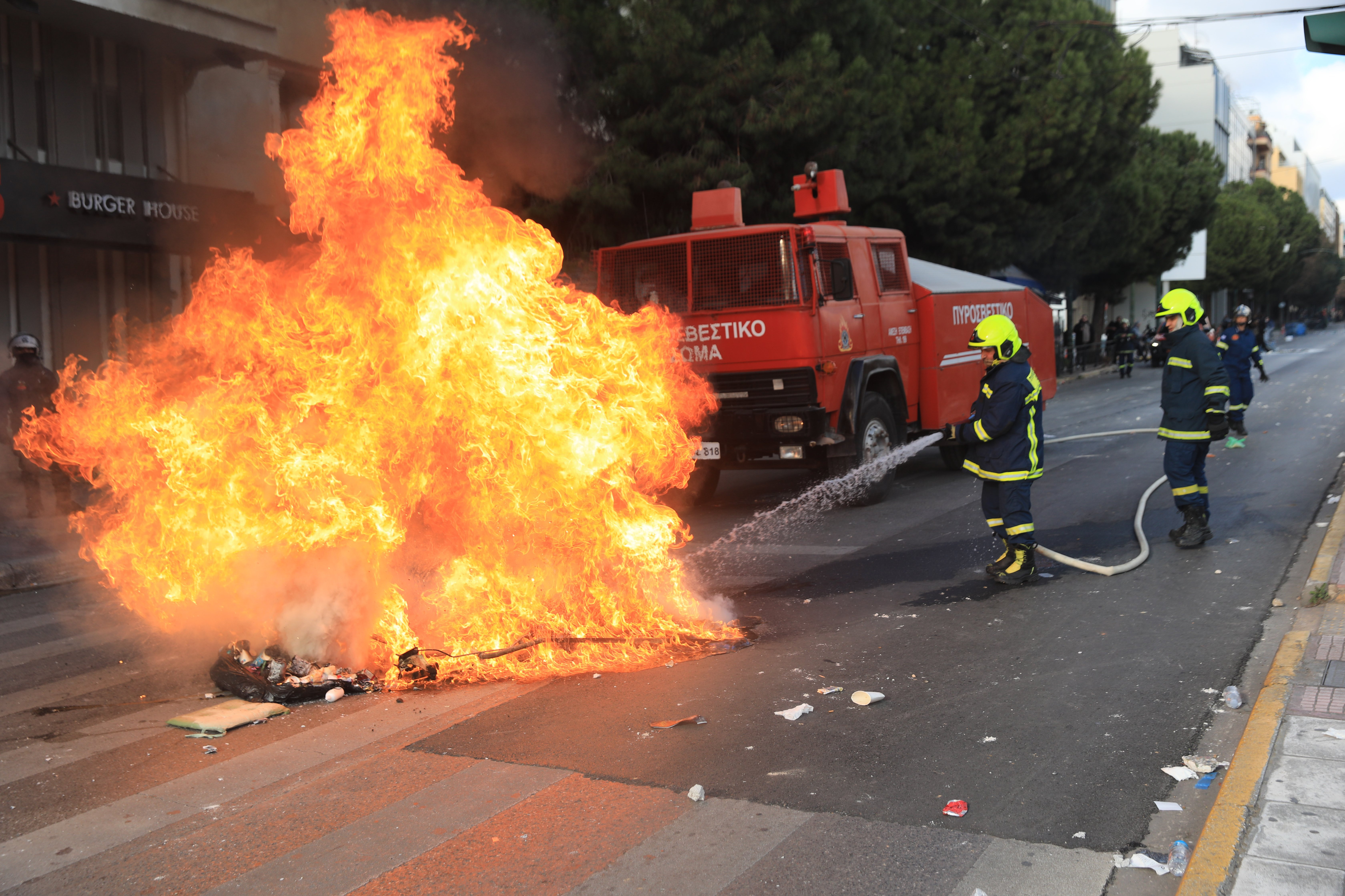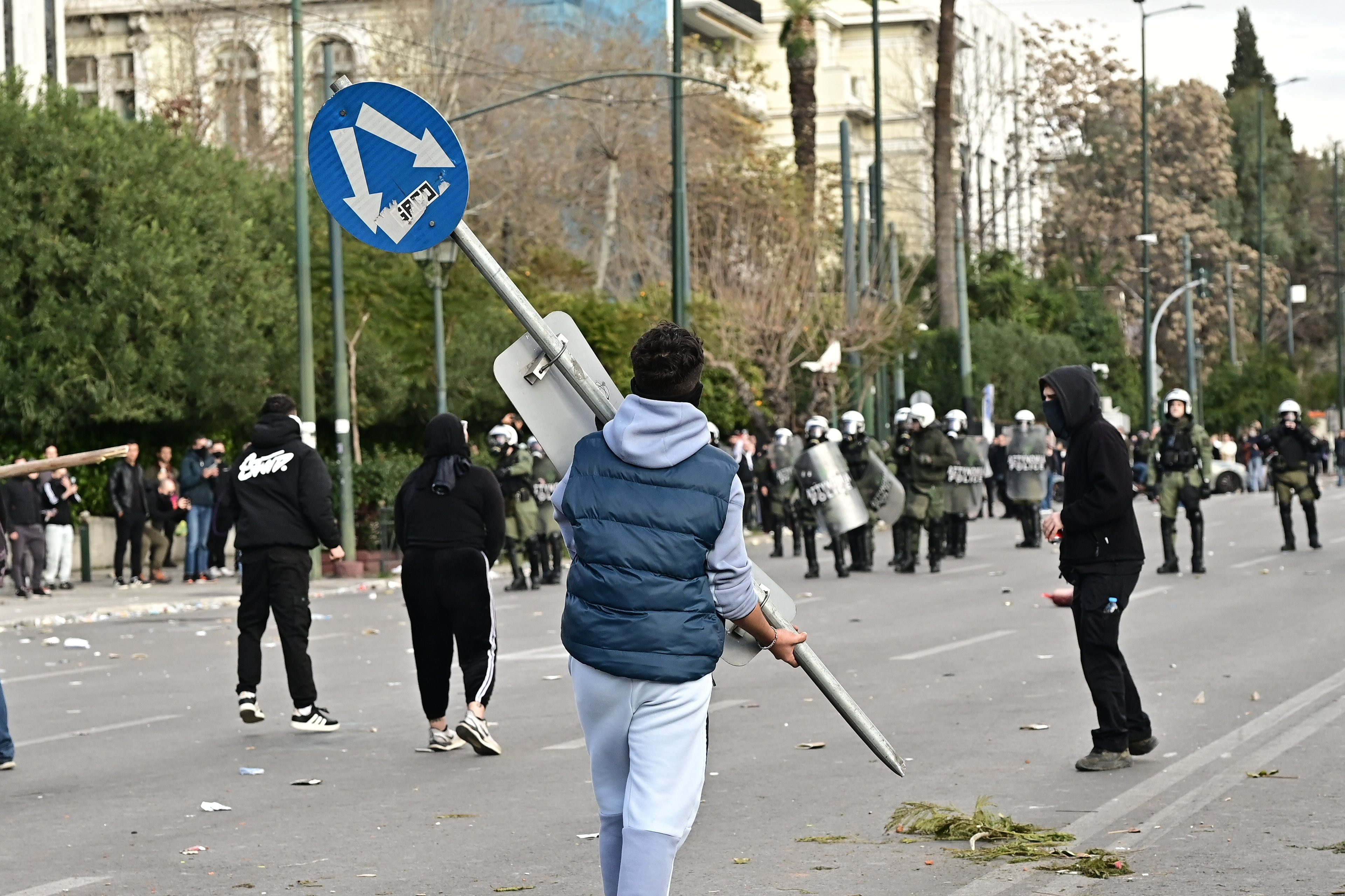Σοβαρά επεισόδια εκτυλίχθηκαν στις οδούς γύρω από την Πλατεία Συντάγματος με το πέρας της πορείας για τη συμπλήρωση δύο ετών από την εθνική τραγωδία των Τεμπών.