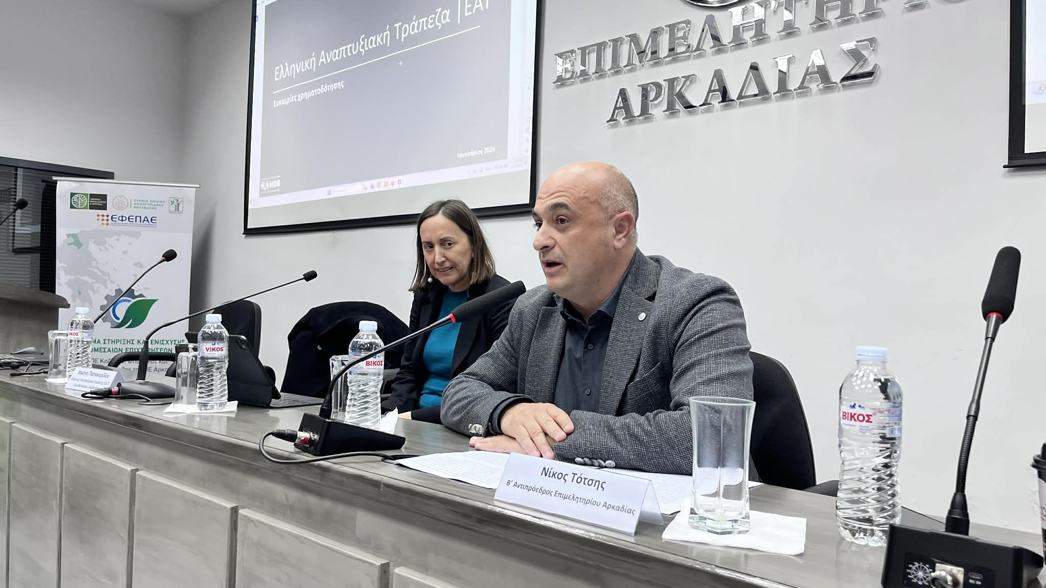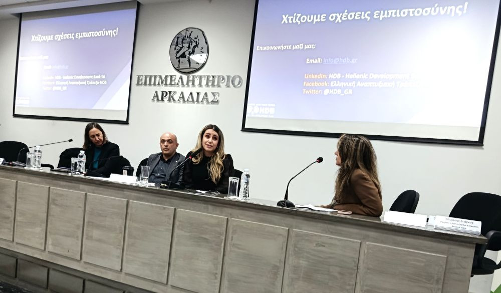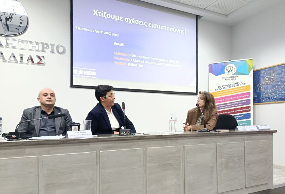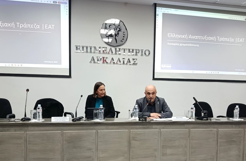 Στην κατάμεστη αίθουσα εκδηλώσεων του Επιμελητηρίου Αρκαδίας ο Β' Αντιπρόεδρος του Επιμελητηρίου κ. Νίκος Τότσης, εκπροσωπώντας τον Πρόεδρο κ. Γιάννη Τρουπή, χαρακτήρισε την Ελληνική Αναπτυξιακή Τράπεζα στρατηγικό σύμμαχο για τη χρηματοδότηση και την εξωστρέφεια των ΜμΕ, ενώ ο Περιφερειάρχης Πελοποννήσου, κ. Δημήτρης Πτωχός, τόνισε την εντυπωσιακή ανταπόκριση των επιχειρήσεων στα προγράμματα της Περιφέρειας και της Δίκαιης Αναπτυξιακής Μετάβασης. Η Διευθύνουσα Σύμβουλος της ΕΑΤ, κα Ισμήνη Παπακυρίλλου, παρουσίασε τα καινοτόμα χρηματοδοτικά εργαλεία της Ελληνικής Αναπτυξιακής Τράπεζας που προσφέρουν χαμηλό κόστος και ιδιαίτερα ευνοϊκούς όρους χρηματοδότησης, καθώς και τα εργαλεία διασύνδεσης και κατάρτισης που παρέχονται δωρεάν προς τις επιχειρήσεις.