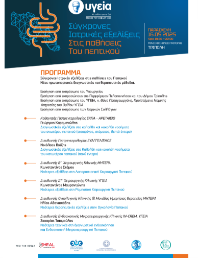 Μια υψηλού επιπέδου επιστημονική ημερίδα με τίτλο «Σύγχρονες Ιατρικές Εξελίξεις στις Παθήσεις του Πεπτικού: Νέες Πρωτοποριακές Διαγνωστικές και Θεραπευτικές Μέθοδοι» θα πραγματοποιηθεί την Παρασκευή 16 Μαΐου 2025, από τις 19:30 έως τις 22:00, στο Μουσικό Σχολείο Τρίπολης.