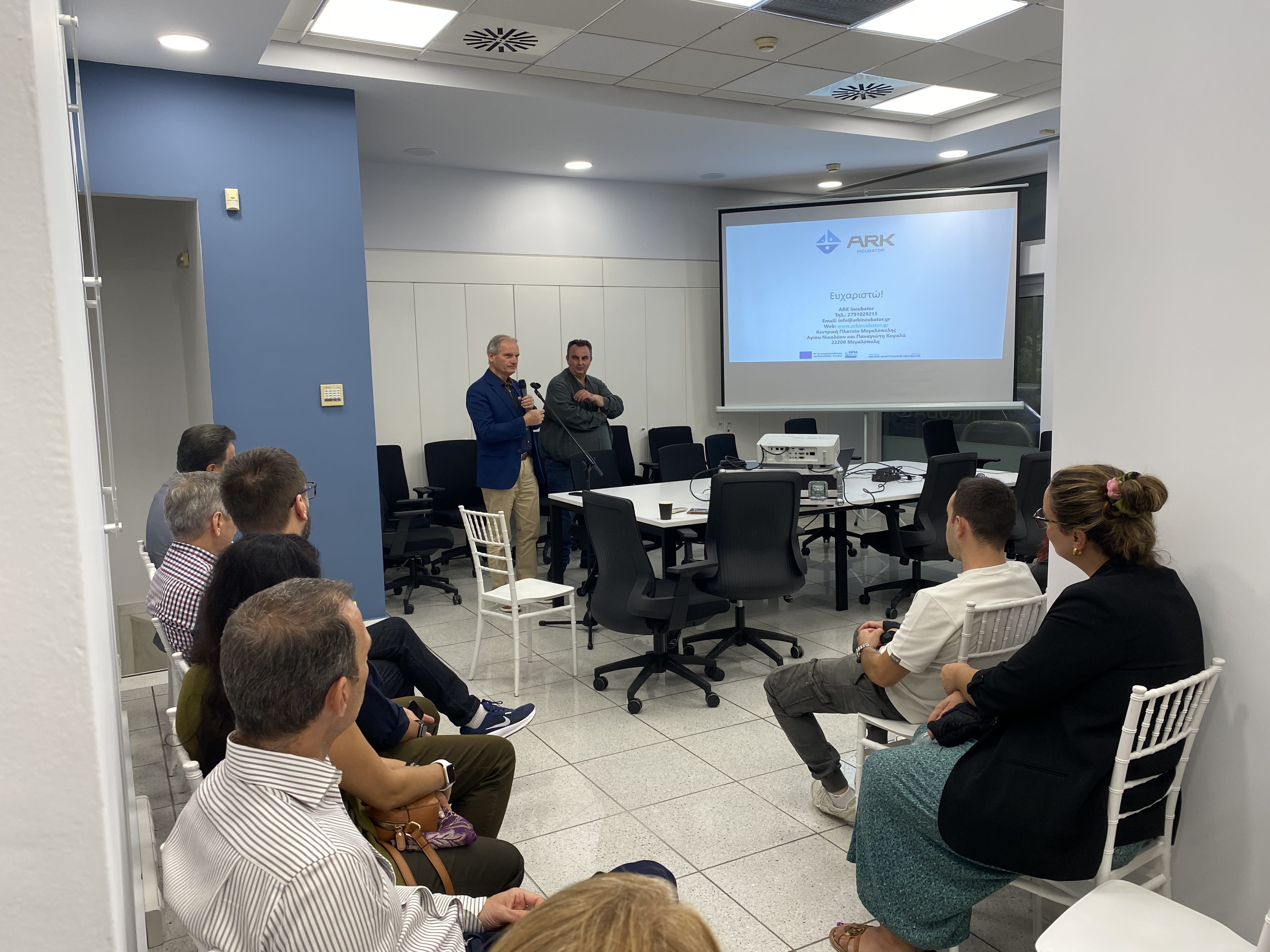 Το οδοιπορικό ολοκληρώθηκε στο χώρο της Θερμοκοιτίδας Ark Incubator όπου ο κ. Γιάννης Παπαδημητρίου και ο κ. Φραγκίσκος Θεοφύλακτος εκ μέρους της ένωσης εταιρειών – φορέα υλοποίησης του έργου, ενημέρωσαν για τις υπηρεσίες ανάπτυξης της καινοτομίας και της επιχειρηματικότητας που παρέχονται, καθώς επίσης και για τη δυνατότητα εγκατάστασης επιχειρήσεων στους χώρους του Ark.