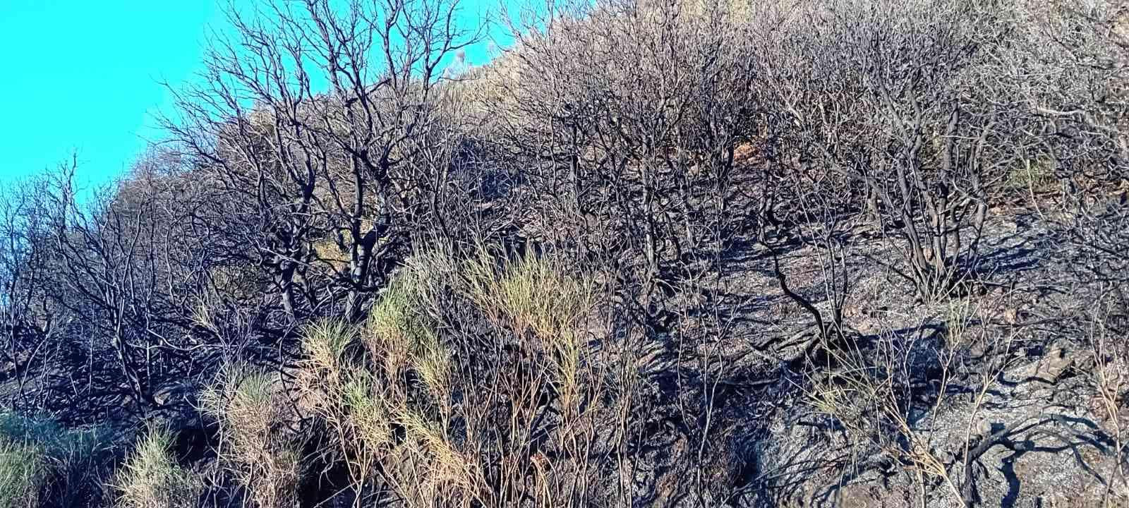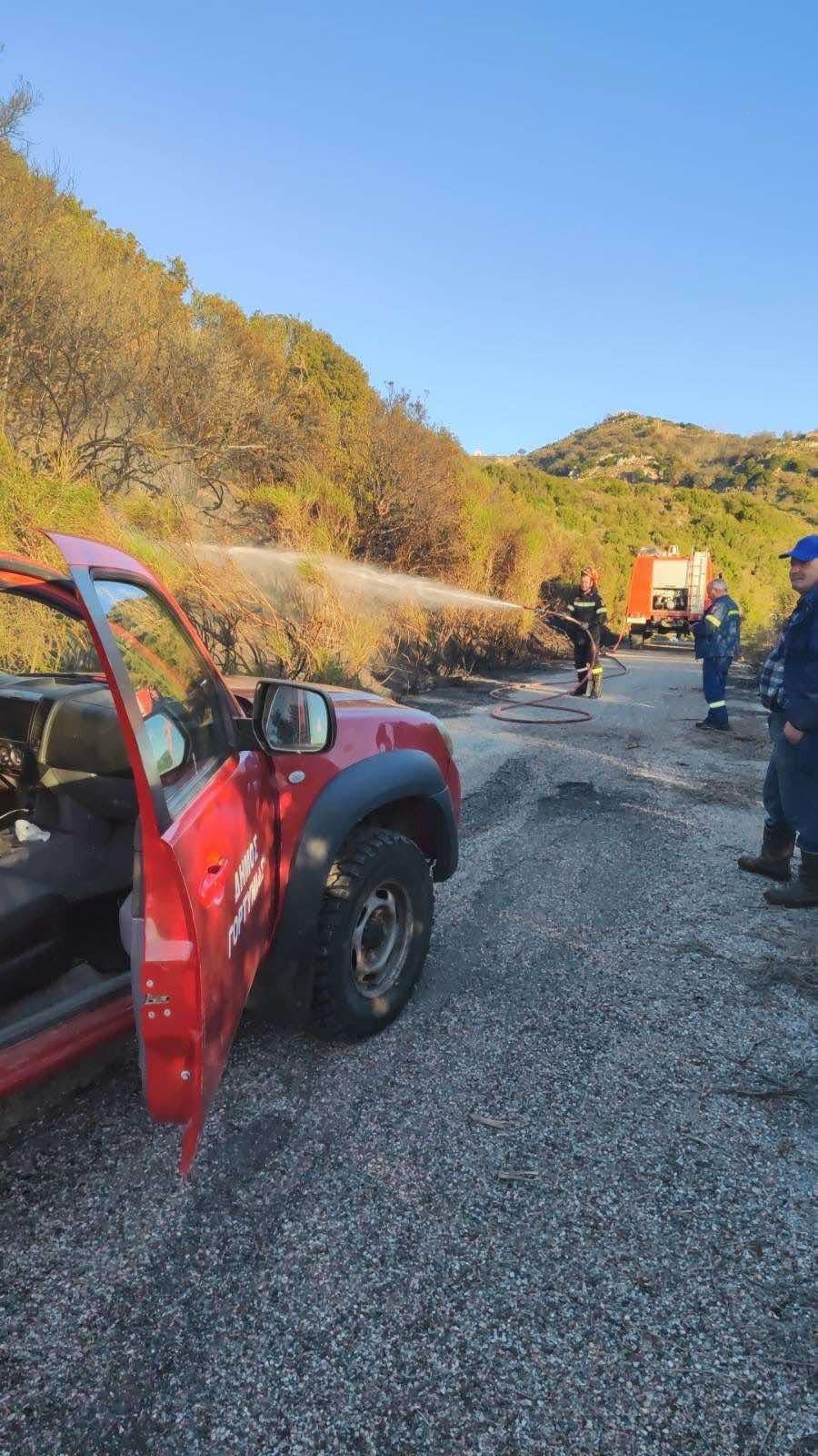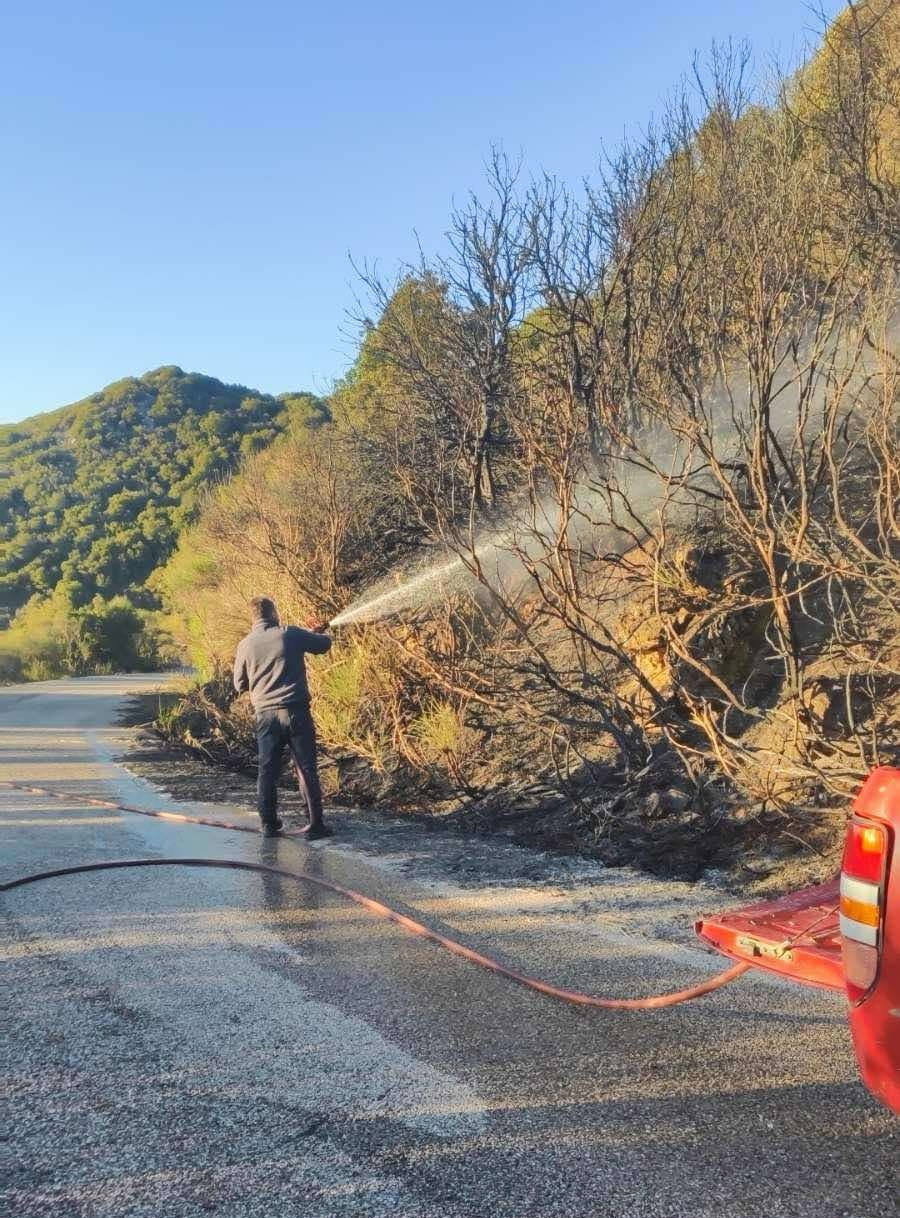Η πυρκαγιά που ξεκίνησε από άγνωστη μέχρι στιγμής αιτία από το πρανές του δρόμου έκαψε περίπου 500 τετραγωνικά μέτρα δασικής έκτασης με πουρνάρια.