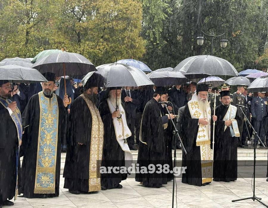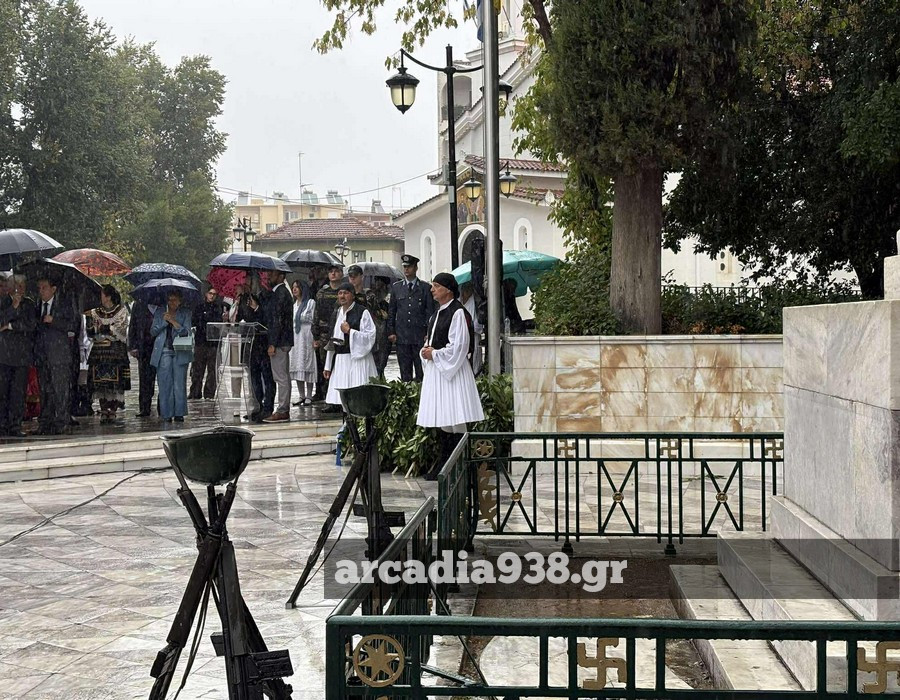 Υπό καταρρακτώδη βροχή τελέστηκε φέτος η επιμνημόσυνη δέηση και η κατάθεση των στεφάνων.