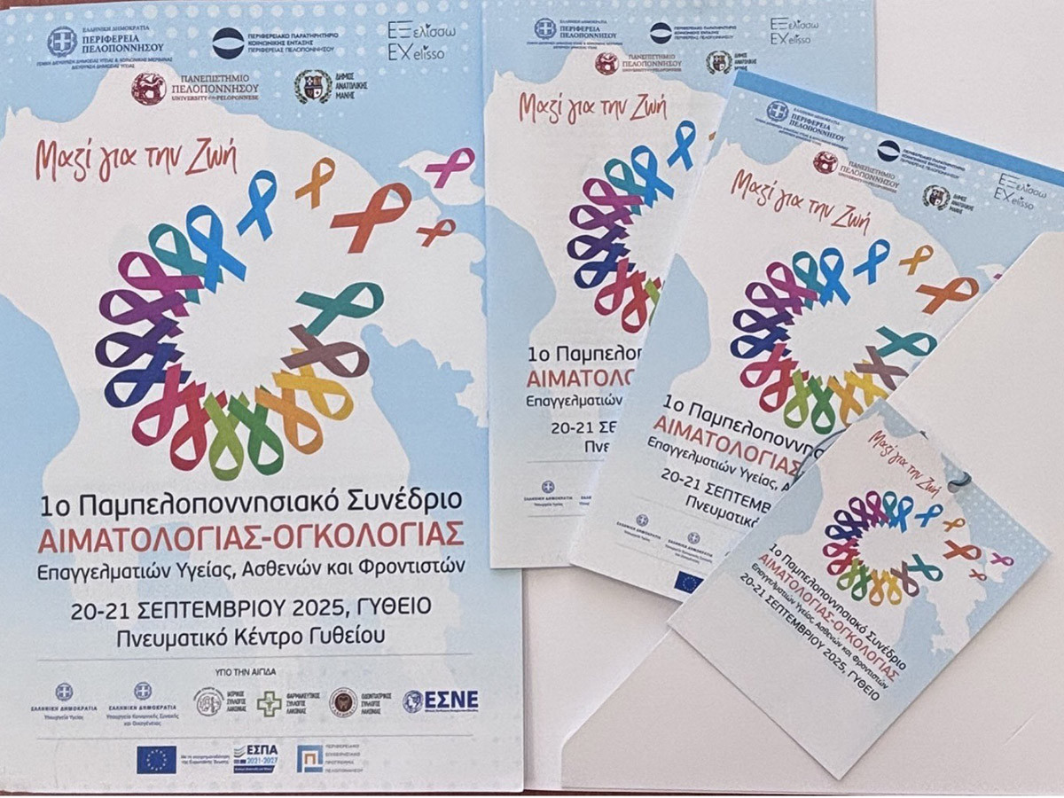 Με μεγάλη επιτυχία ολοκληρώθηκε το 1ο Παμπελοποννησιακό Συνέδριο Αιματολογίας – Ογκολογίας Επαγγελματιών Υγείας, Ασθενών και Φροντιστών, που πραγματοποιήθηκε στις 20 και 21 Σεπτεμβρίου 2025, στο Πνευματικό Κέντρο Γυθείου, υπό τον τίτλο «Μαζί για τη Ζωή».