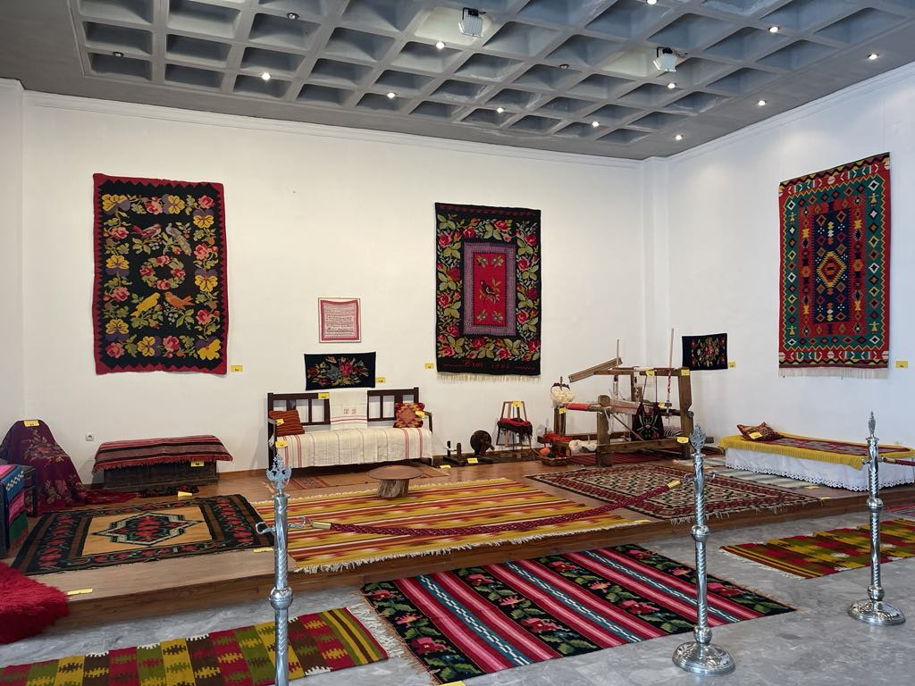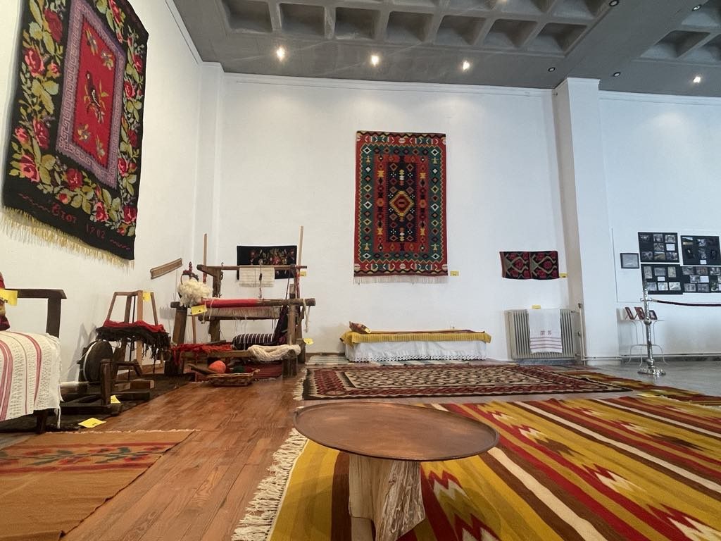 Δίπλα τους, ένας στημένος αργαλειός σας περιμένει να ψιθυρίσει την ιστορία του, όπως την άκουσε από τις γυναίκες που έπλεκαν στον ρυθμό της καρδιάς τους. Κατασκευασμένα από μαλλί προβάτου και τράγιου, μετάξι, βαμβάκι, λινάρι, κανάβι και σπάρτο, τα υφαντά εντυπωσιάζουν με την ποικιλία και την αρτιότητα της τεχνικής τους, τους χρωματικούς συνδυασμούς και τον πλούτο των διακοσμητικών θεμάτων τους.