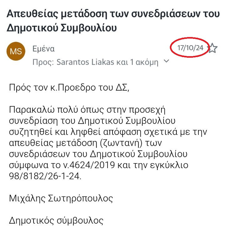 Επειδή τα πολλά λόγια είναι φτώχεια, παραθέτω τα στοιχεία που αποδεικνύουν πως εδώ και ένα χρόνο έχουμε ζητήσει 2 φορές επισήμως, βάζοντας το ως θέμα και στο συμβούλιο, την ζωντανή μετάδοση των συνεδριάσεων του Δημοτικού συμβουλίου και μάλιστα τηλεοπτικά, όχι απλά ραδιοφωνικά, για να μπορεί να τα παρακολουθεί οποιοσδήποτε ανά πάσα ώρα και στιγμή ακόμα και από το κινητό του.