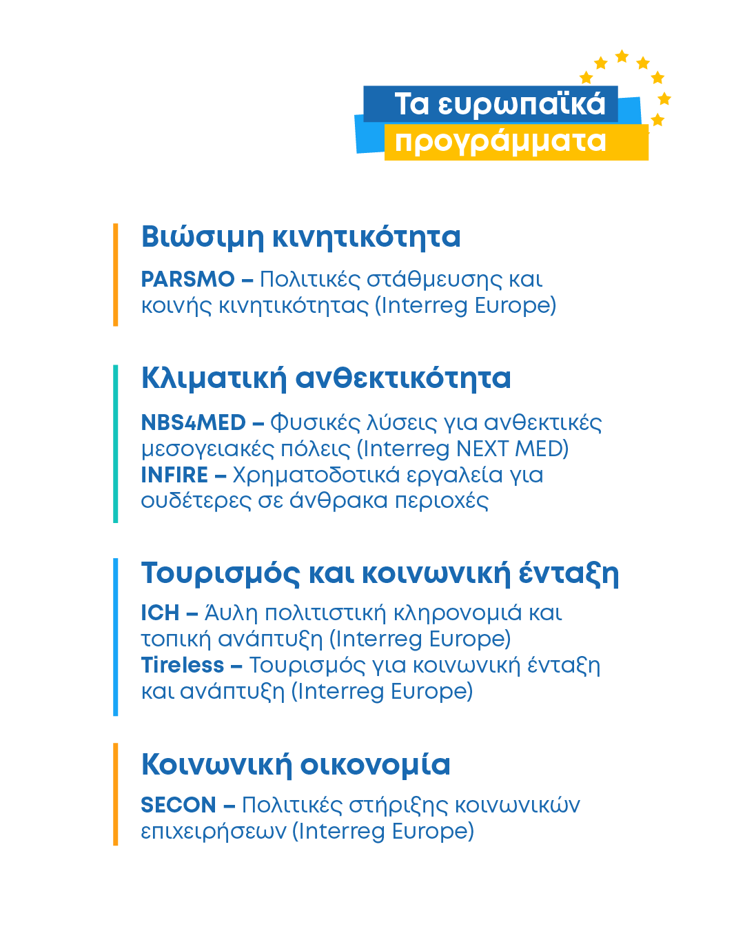 Τα εν λόγω ευρωπαϊκά προγράμματα αγγίζουν διάφορους τομείς του επιστητού, καλύπτοντας κρίσιμους τομείς καινοτομίας, πράσινης μετάβασης, κοινωνικής συνοχής και επιχειρηματικότητας.