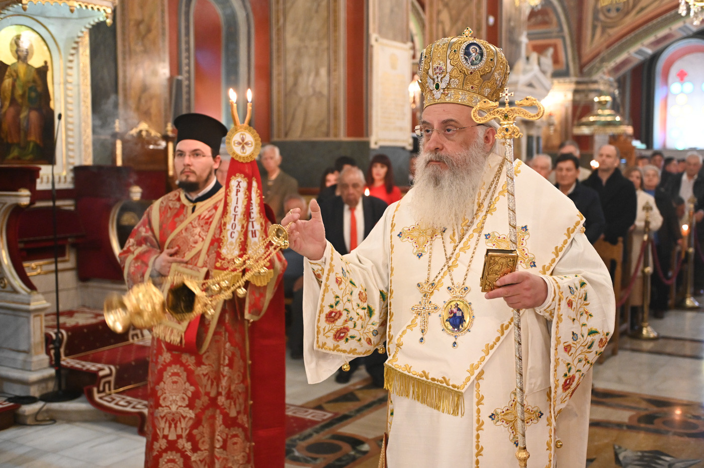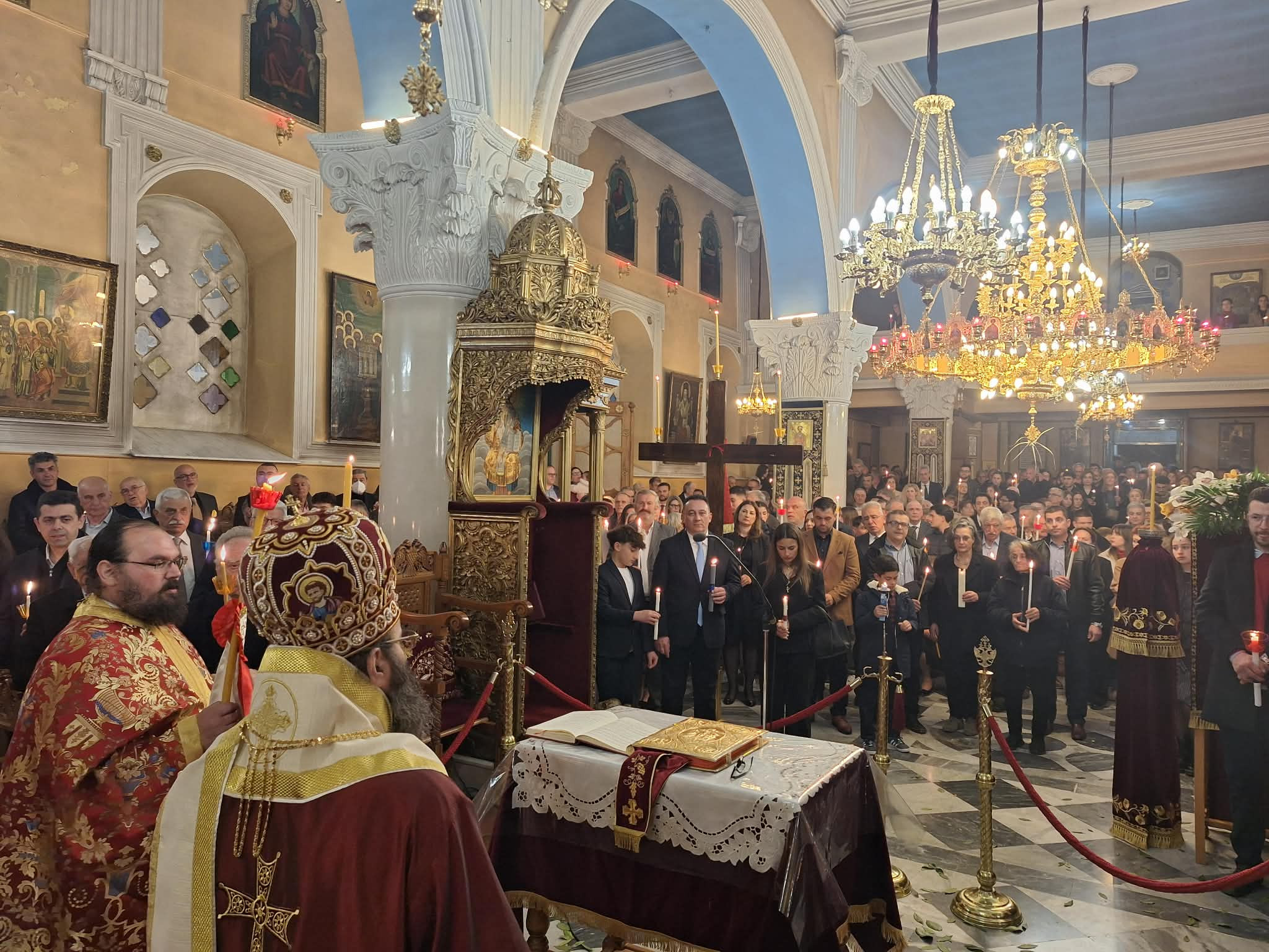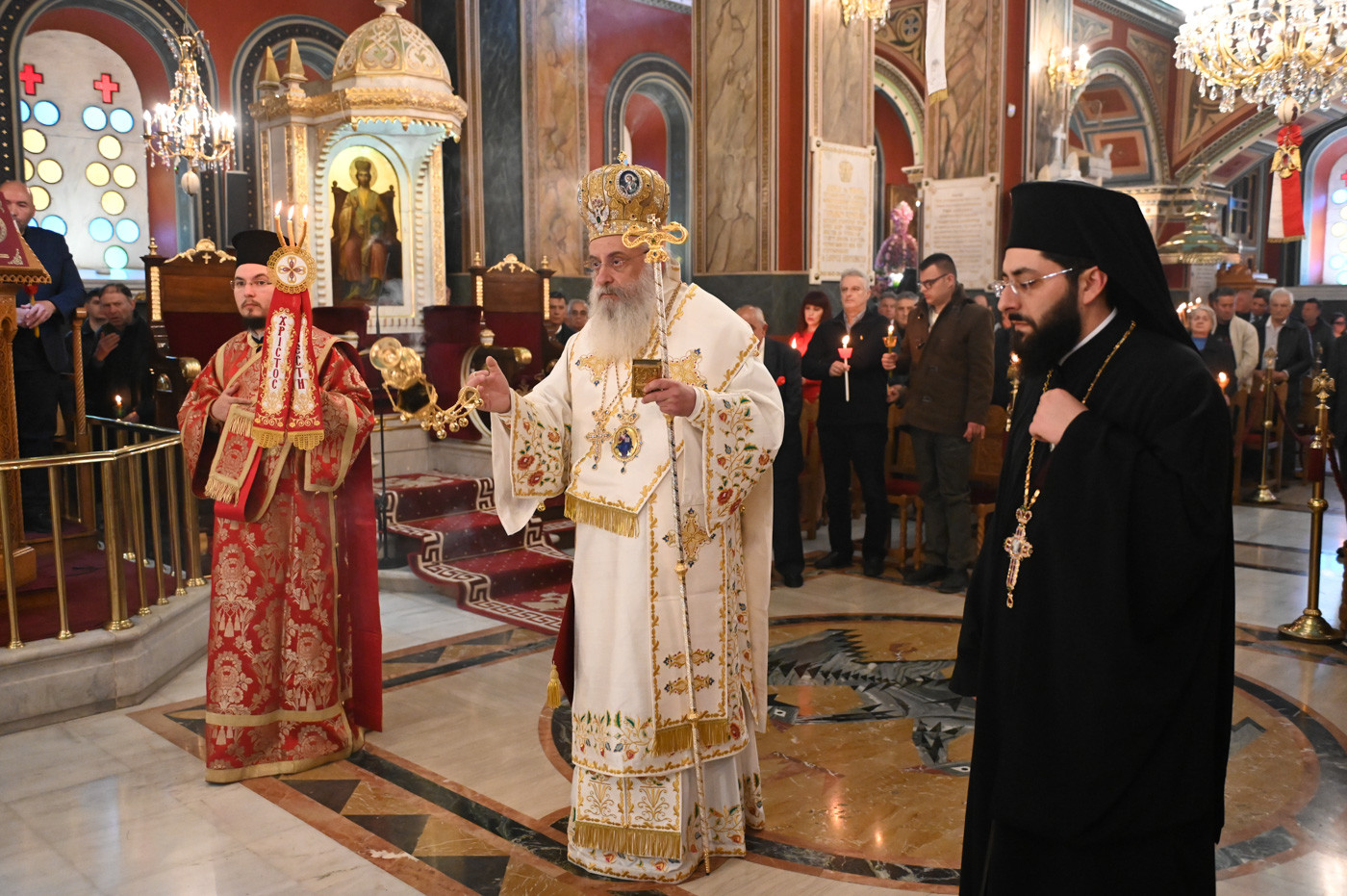Ο Μητροπολίτης μετά την ανάγνωση του Ιερού Ευαγγελίου και υπό τους ήχους χαρμοσύνων κωδωνοκρουσιών, ανήγγειλε το «Χριστός Ανέστη». Εν συνεχεία, τέλεσε την Πανηγυρική Αναστάσιμη Θεία Λειτουργία πλαισιούμενος από τον Πρωτοσύγκελλο της Ιεράς Μητροπόλεως Πανοσιολ. Αρχιμ. Στέφανο Καππέ και τον Διάκονο π. Αλέξιο Ζαρζάνη. Παρέστησαν ο Αναπλ. Περιφερειάρχης κ. Λαμπρόπουλος, Αντιδήμαρχοι, Περιφερειακοί και Δημοτικοί Σύμβουλοι, εκπρόσωποι των Ενόπλων Δυνάμεων και των Σωμάτων Ασφαλείας.