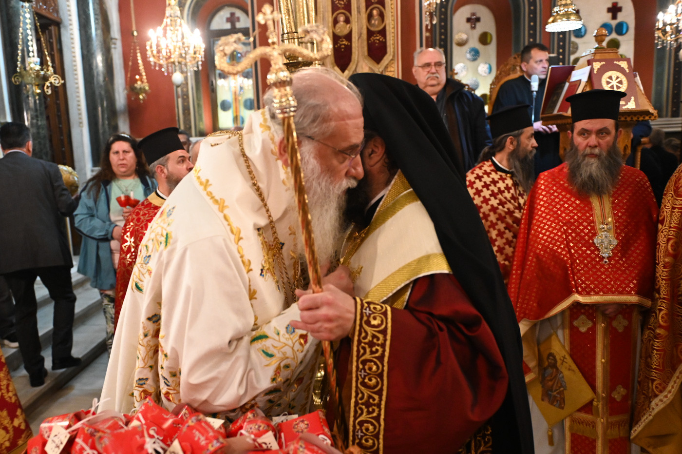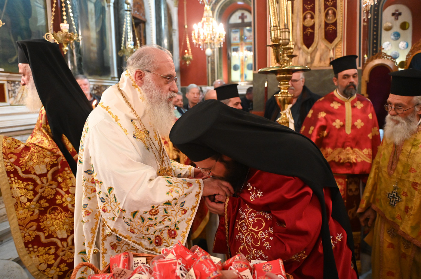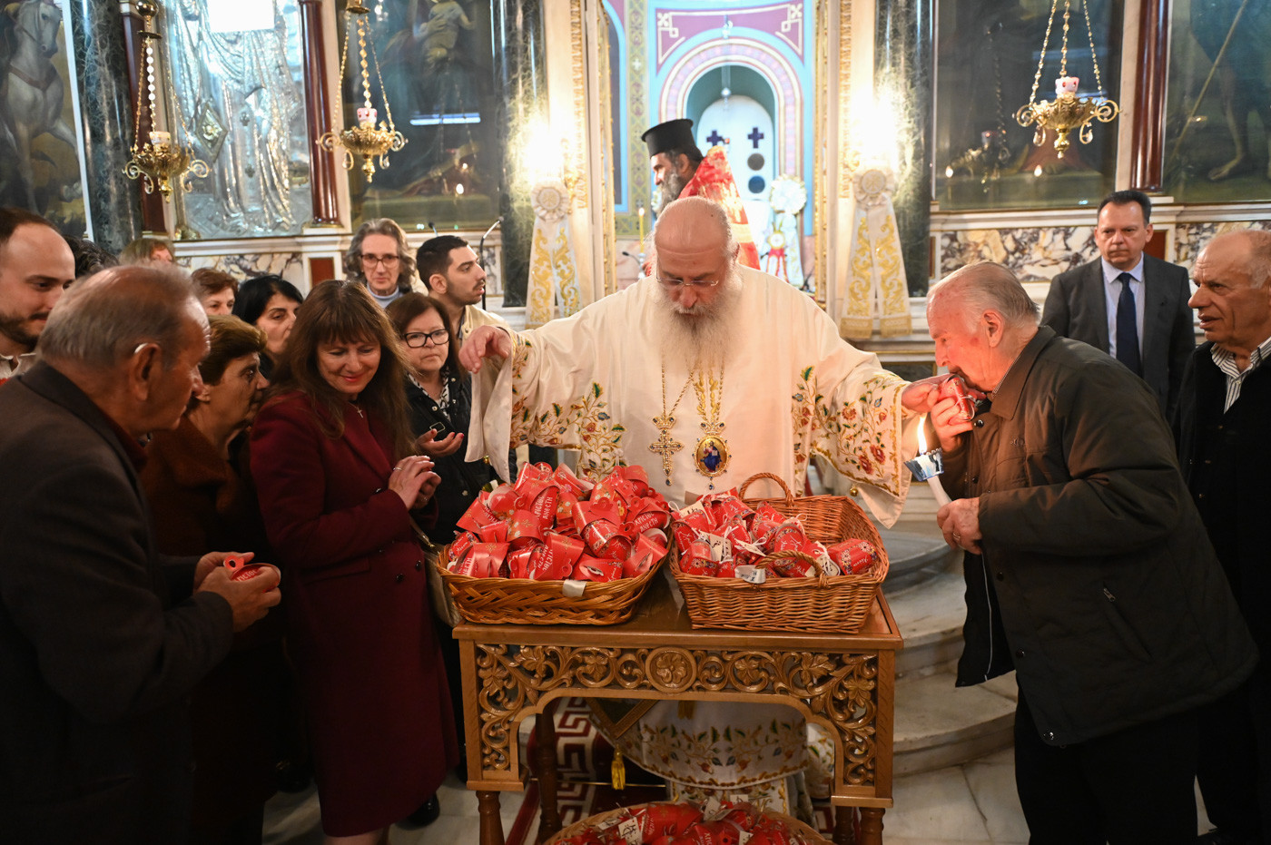 Με το πέρας του Εσπερινού ο Μητροπολίτης διένειμε σε Ιερείς, άρχοντες και πιστούς κόκκινα αυγά αναφωνώντας τον Αναστάσιμο χαιρετισμό “Χριστός Ανέστη”