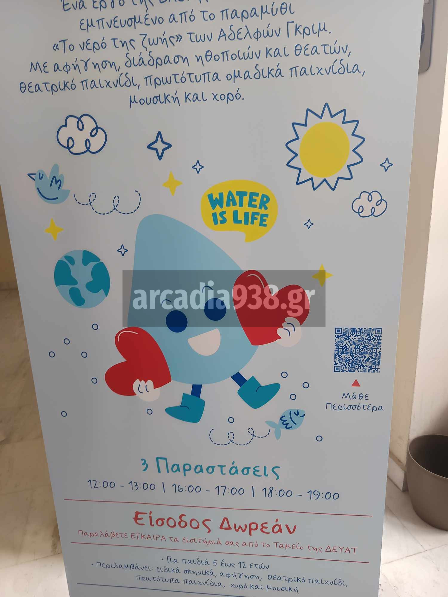 Στο πλαίσιο του εορτασμού της Παγκόσμιας Ημέρας Νερού, η ΔΕΥΑ Τρίπολης διοργανώνει- και φέτος- εκδήλωση που περιλαμβάνει διαδραστική παράσταση που απευθύνεται σε παιδιά, ηλικίας 5-12 ετών. Οι παραστάσεις θα πραγματοποιηθούν σήμερα, στις ώρες: 12:00 – 13:00, 16:00 – 17:00 και 18:00 – 19:00.
