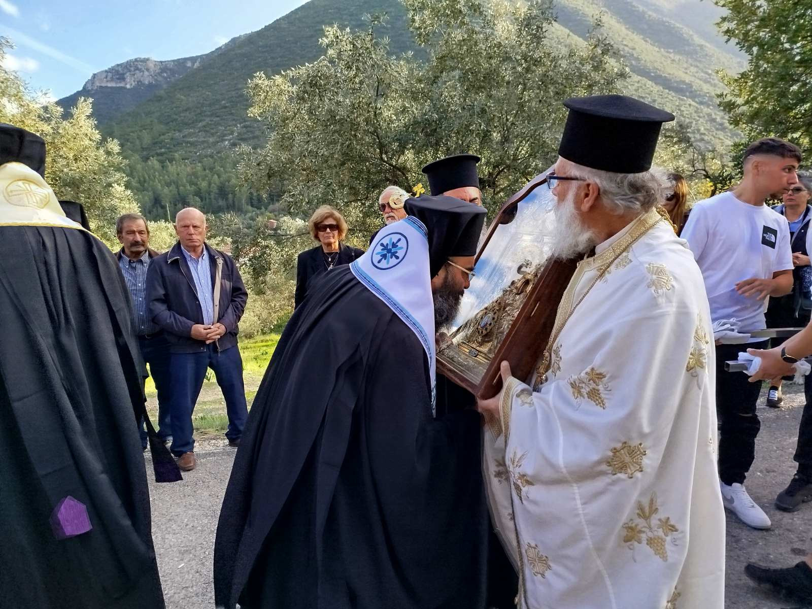 Ο προσκληθείς Σεβασμιώτατος Μητροπολίτης Γόρτυνος και Μεγαλοπόλεως κ. Νικηφόρος προεξήρχε της λιτανευτικής πομπής, συμπαραστατούμενος από τον οικείο Μητροπολίτη Μαντινείας και Κυνουρίας κ. Επιφάνιο, τον Θεοφιλέστατο Επίσκοπο Τεγέας κ. Θεόκλητο, καθώς και τον πρόεδρο της διαχειριστικής επιτροπής της Ιεράς Μονής, με τη συμμετοχή των ιερέων της
