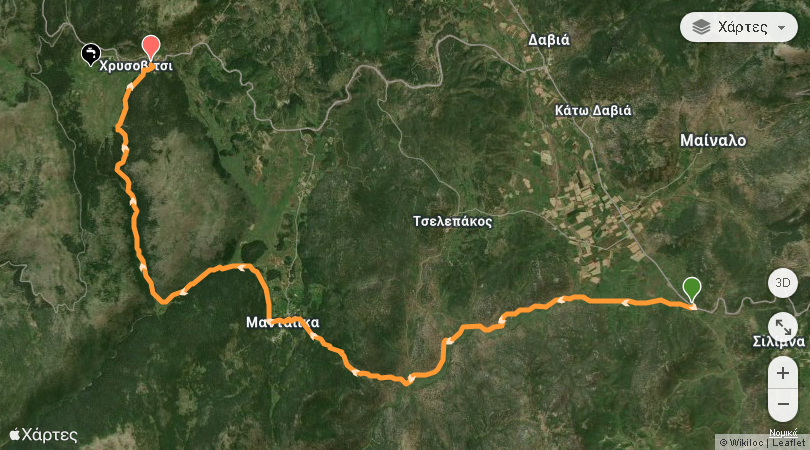 Οι δύο πορείες μας έγιναν πάνω στο μπλε μονοπάτι, που έχει εντοπίσει, καθορίσει και σηματοδοτήσει ο Σύλλογός μας. Η κάθε μία ομάδα αποτελούνταν από 25 άτομα. Η πρώτη ομάδα ξεκίνησε από τη θέση Καρτερόλι, μετά τη Σιλίμνα, κινήθηκε αρχικά δίπλα στον ποταμό Ελισσώνα, σε επίπεδη και ακάλυπτη από δάσος επιφάνεια, και κατόπιν ανηφόρησε προς τα Μανταίικα, μέσα από το πρόσφατα καθαρισμένο από μέλη μας δασωμένο μονοπάτι. Ύστερα από μια ολιγόλεπτη στάση στα Μανταίικια, συνεχίσαμε προς το Χρυσοβίτσι, περπατώντας, σε όλη τη διάρκεια της πορείας, μέσα στο καταπληκτικό ελατοδάσος του Μαινάλου. Οι εικόνες και οι εμπειρίες που αποκομίσαμε δεν είναι εύκολο να περιγράφουν με λόγια. Στο γραφικό και ιστορικό Χρυσοβίτσι φθάσαμε μετά 5 ώρες πορείας και γευματίσαμε στις τοπικές ταβέρνες.