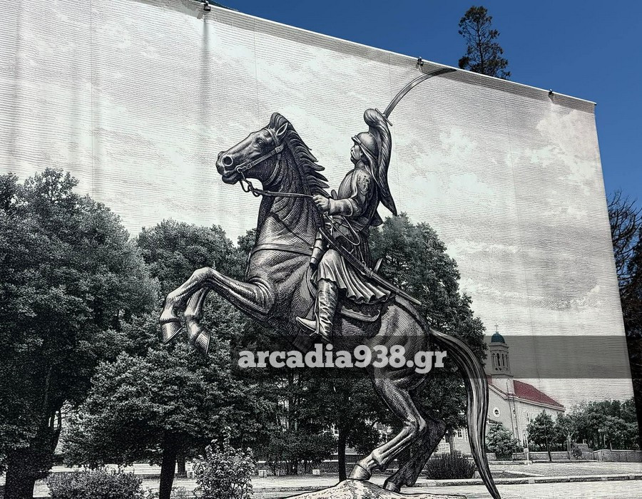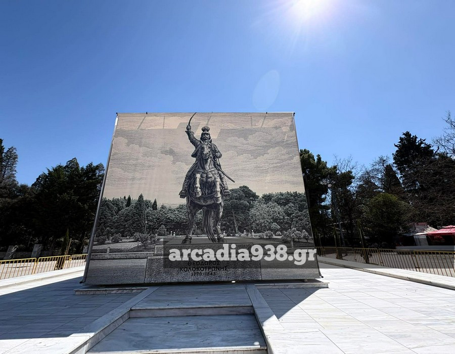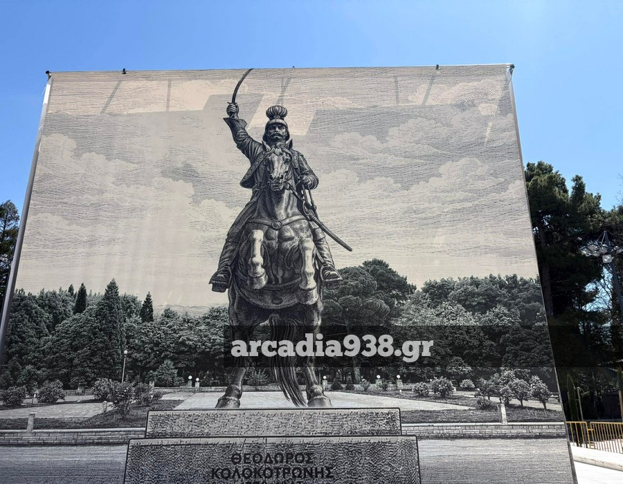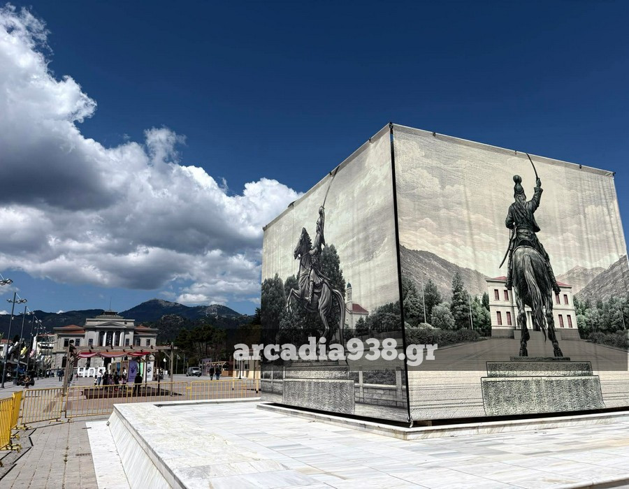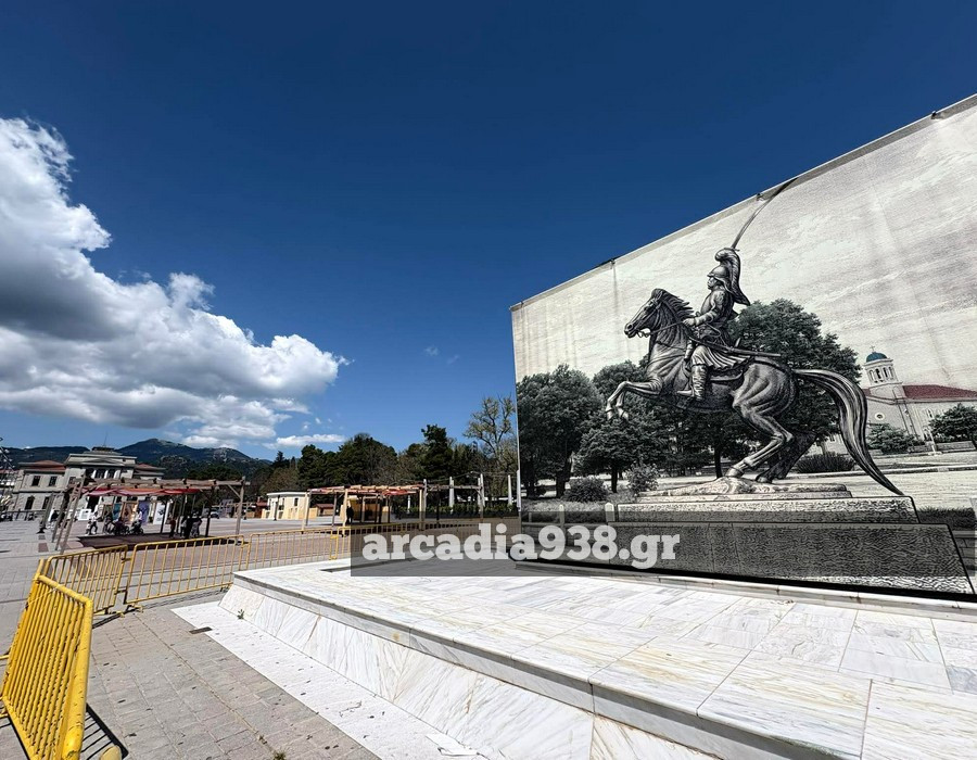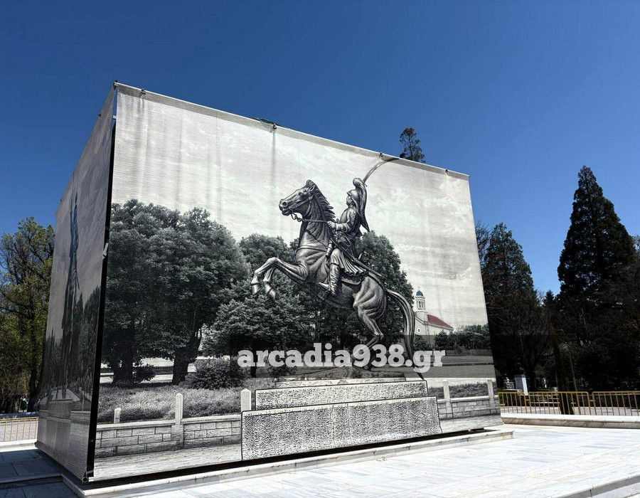 Ο δήμος Τρίπολης προχώρησε στην τοποθέτηση μεγάλων διαστάσεων φωτογραφιών περιμετρικά του βάθρου, που αναπαριστούν τον έφιππο ανδριάντα.
