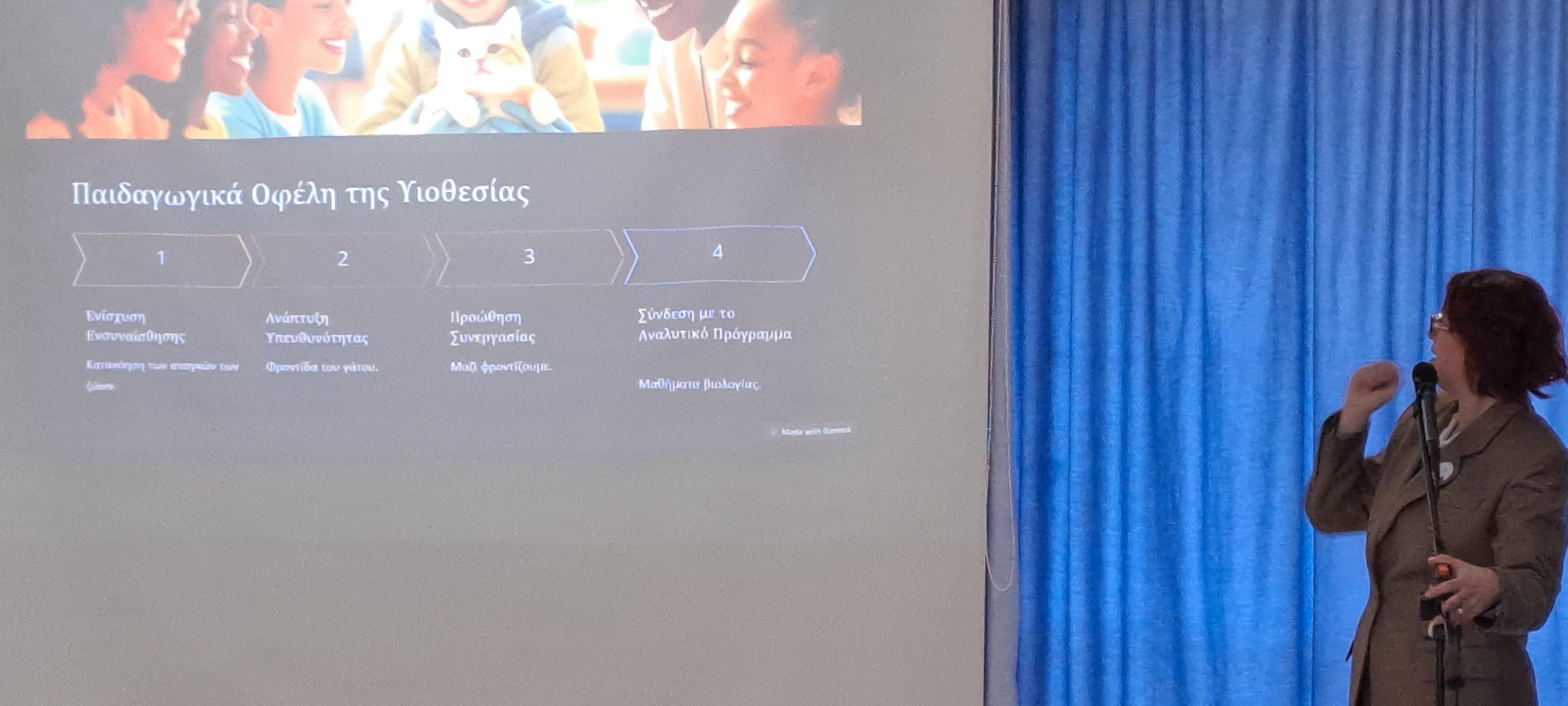 Ιδιαίτερη αναφορά έγινε στα λόγια της κας Κατερίνας Παπαποστόλου εκπ/κού , συγγραφέα, πιστοποιημένης ζωοθεραπεύτριας, η οποία τονίζει ότι ένα ζώο συντροφιάς συμβάλλει στην ψυχική και σωματική υγεία των παιδιών, ενισχύει την κοινωνικοποίησή τους και καλλιεργεί αξίες όπως η συντροφικότητα και η υπευθυνότητα. Μέσα από το παράδειγμα του Γκομπολίνο, τα παιδιά μας διδάχθηκαν την αποδοχή, την αγάπη και τη συμπόνια προς τα αδύναμα πλάσματα.