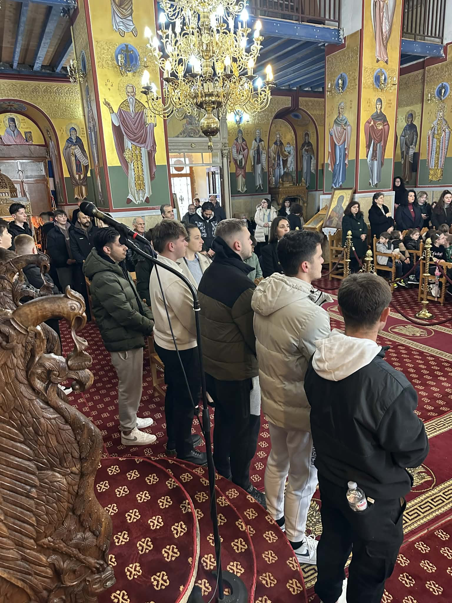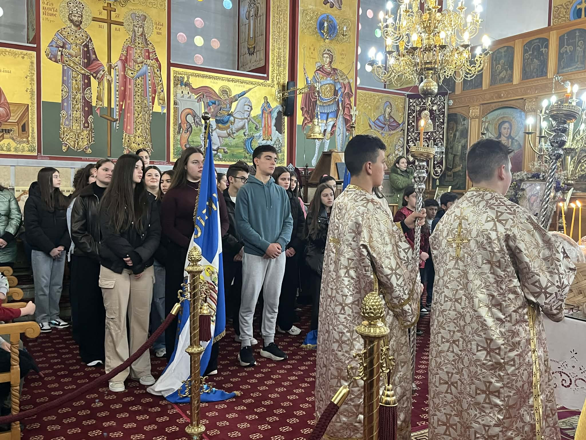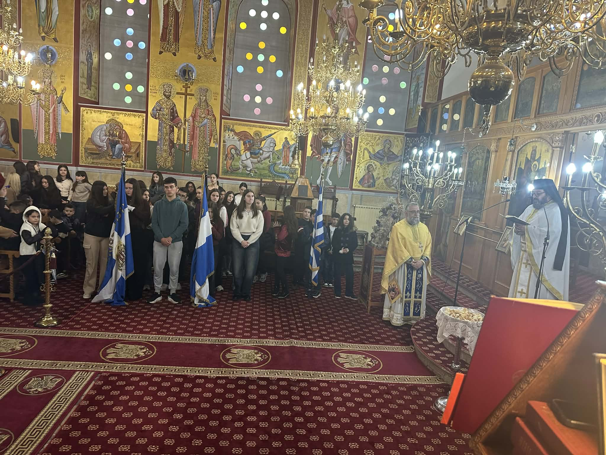 Οι εκδηλώσεις κορυφώθηκαν με την πανηγυρική Θεία Λειτουργία και αρτοκλασία από τον ιερομόναχο πατήρ Ραφαήλ και πατήρ Ιωάννη στον Ιερό Ναό Αγίου Γεωργίου Τροπαίων. Στον εκκλησιασμό παρέστησαν οι μαθητές και οι μαθήτριες όλων των σχολικών μονάδων της περιοχής, κρατώντας τις σημαίες, καθώς και οι διευθυντές και οι εκπαιδευτικοί τους, δίνοντας ξεχωριστό τόνο στην ημέρα.