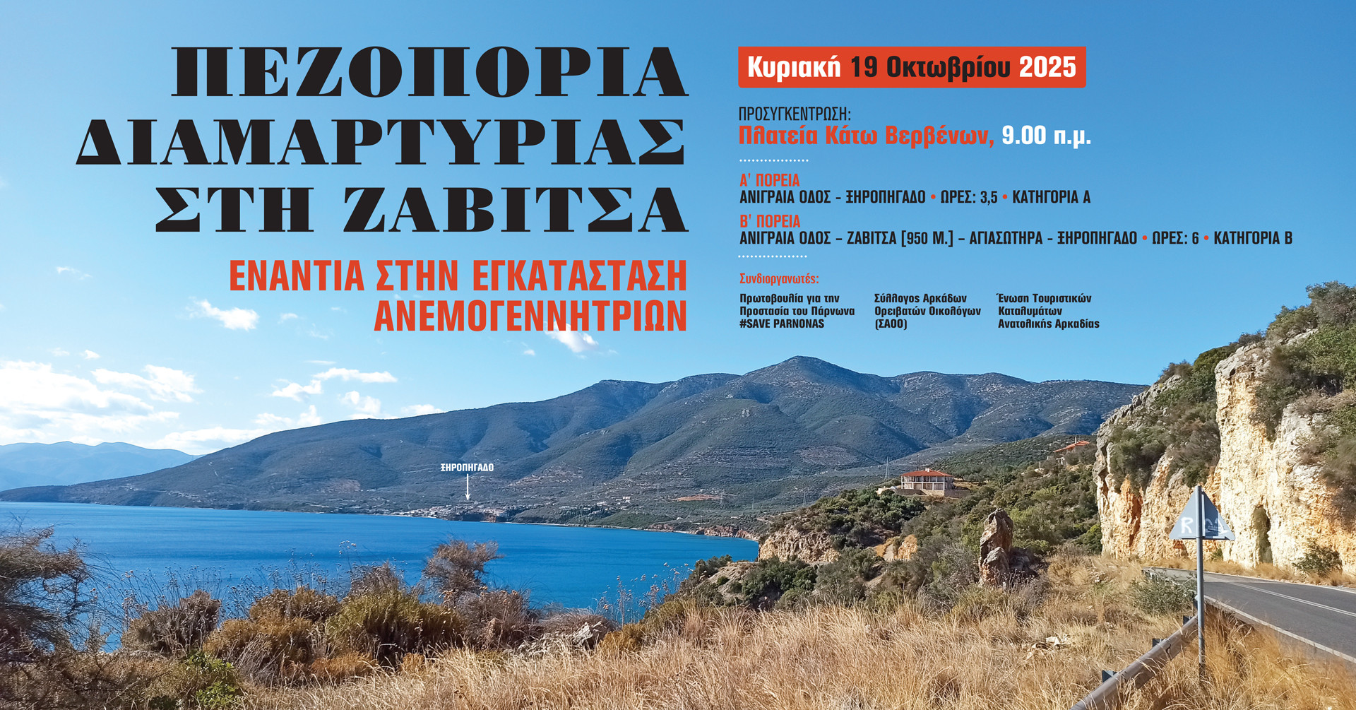 Η Πρωτοβουλία για την Προστασία του Πάρνωνα #SAVE_PARNONAS σε συνεργασία με τον Σύλλογο Αρκάδων Ορειβατών Οικολόγων (ΣΑΟΟ) και την Ένωση Τουριστικών Καταλυμάτων Ανατολικής Αρκαδίας, διοργανώνουν πεζοπορία διαμαρτυρίας ενάντια στην εγκατάσταση ανεμογεννητριών στη Ζάβιτσα, την Κυριακή 19 Οκτωβρίου 2025.