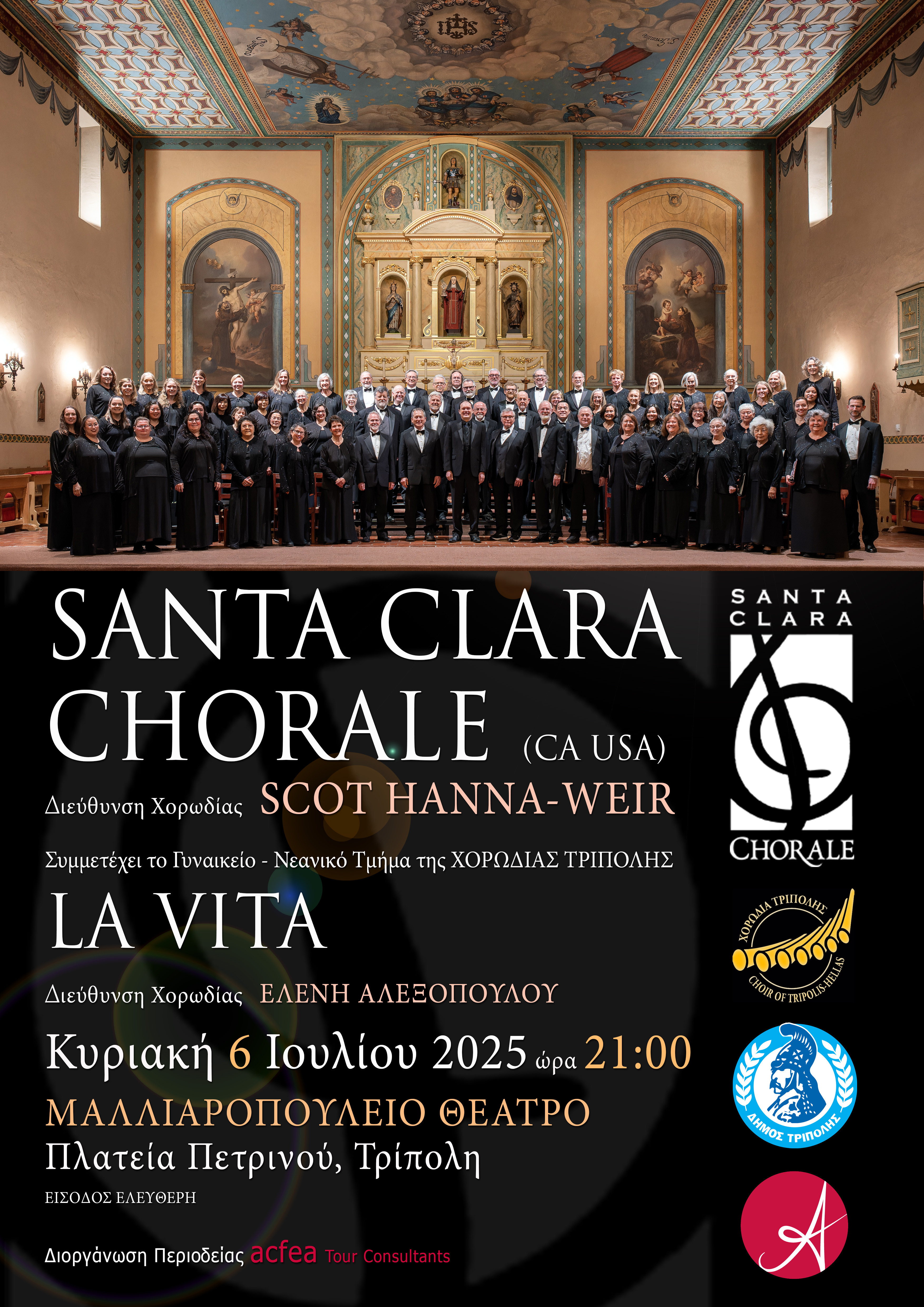 Με χαρά θα υποδεχτεί την 60μελή Αμερικάνικη χορωδία Santa Clara Chorale, στις 6 Ιουλίου στις 9 το βράδυ στο Μαλλιαροπούλειο Θέατρο. Πρόκειται για μια φημισμένη χορωδία από την Καλιφόρνια των ΗΠΑ με ιστορία πάνω από 60 χρόνια και πολλές διάσημες συνεργασίες. Η Santa Clara Chorale προσφέρει υψηλού επιπέδου εντυπωσιακές συναυλίες με ρεπερτόριο κλασικό αλλά και σύγχρονο, τζαζ, spiritual, gospel αναδεικνύοντας το ευρύ φάσμα της Χορωδιακής μουσικής. Η Santa Clara Chorale επέλεξε μεταξύ πολλών χορωδιών τη Γυναικεία – νεανική χορωδία LA VITA να τραγουδήσει μαζί της στα πλαίσια των εμφανίσεών της στην Ελλάδα.