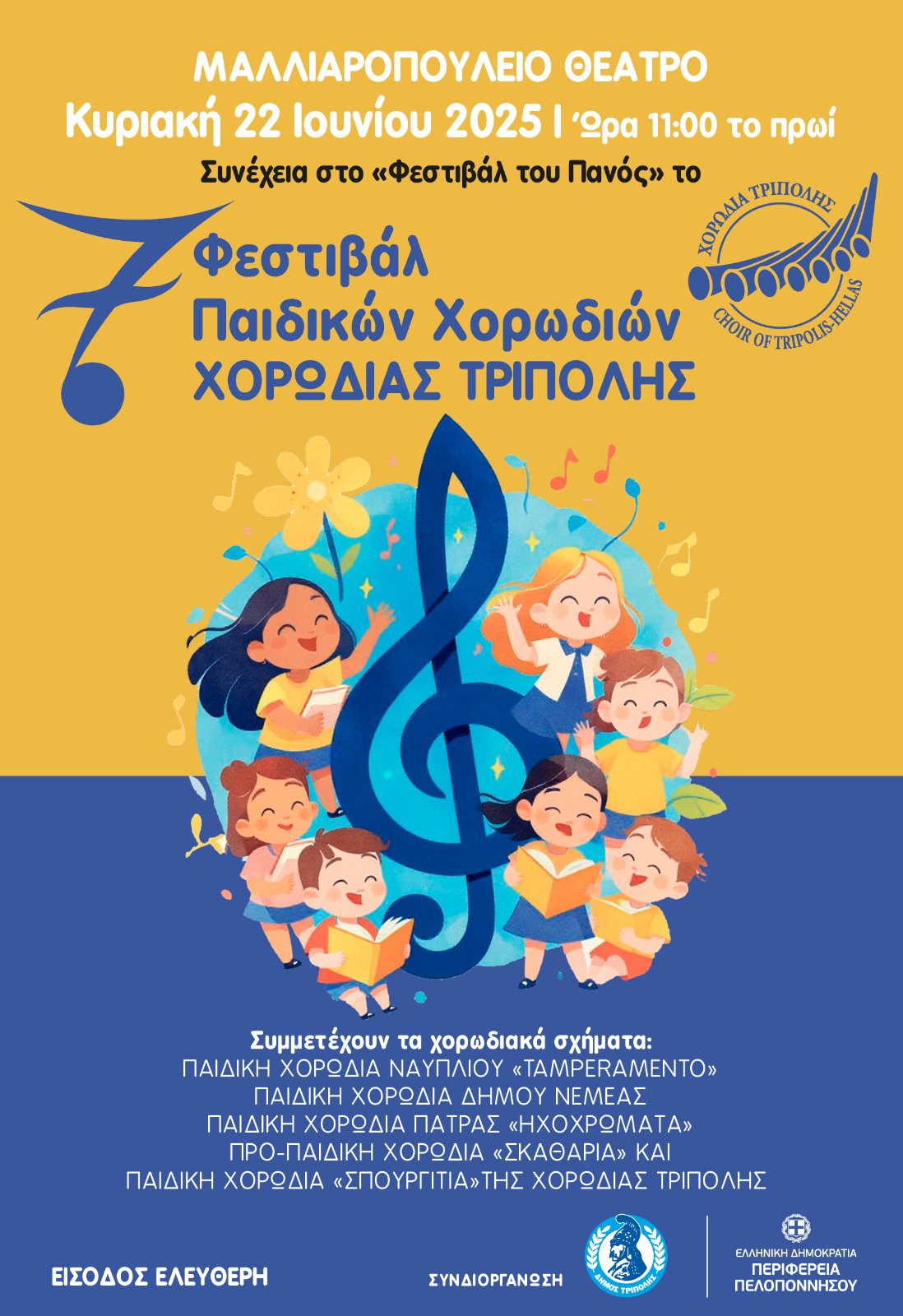 Ο Ιούνιος, όμως, βρήκε τη ΧΟΡΩΔΙΑ ΤΡΙΠΟΛΗΣ να συνεχίζει και το Φεστιβάλ του Πανός, τιμώντας παράλληλα την Ευρωπαϊκή μέρα της Μουσικής! Συγκεκριμένα, η προ-παιδική χορωδία «ΣΚΑΘΑΡΙΑ» με τη Μαέστρο τους, Ελένη Αλεξοπούλου, καθηγήτρια πιάνου και Ανώτερων Θεωρητικών και η παιδική «ΣΠΟΥΡΓΙΤΙΑ» με τη Μαέστρο τους, Αμαλία Γούλα, καθηγήτρια πιάνου και Ανώτερων Θεωρητικών, βρίσκονται επί ποδός για την καθιερωμένη καλοκαιρινή παιδική γιορτή της ΧΟΡΩΔΙΑΣ ΤΡΙΠΟΛΗΣ στις 22 του μηνός, ημέρα Κυριακή στις 11 το πρωί. Τα παιδιά θα μας αποχαιρετήσουν για καλοκαίρι με μια πολύ όμορφη συναυλία γεμάτη ευχάριστες εκπλήξεις! Καλεσμένες τους η παιδική Χορωδία «TAMPERAMENTO» , η παιδική Χορωδία του Δήμου Νεμέας και η παιδική Χορωδία Πάτρας «ΗΧΟΧΡΩΜΑΤΑ».
