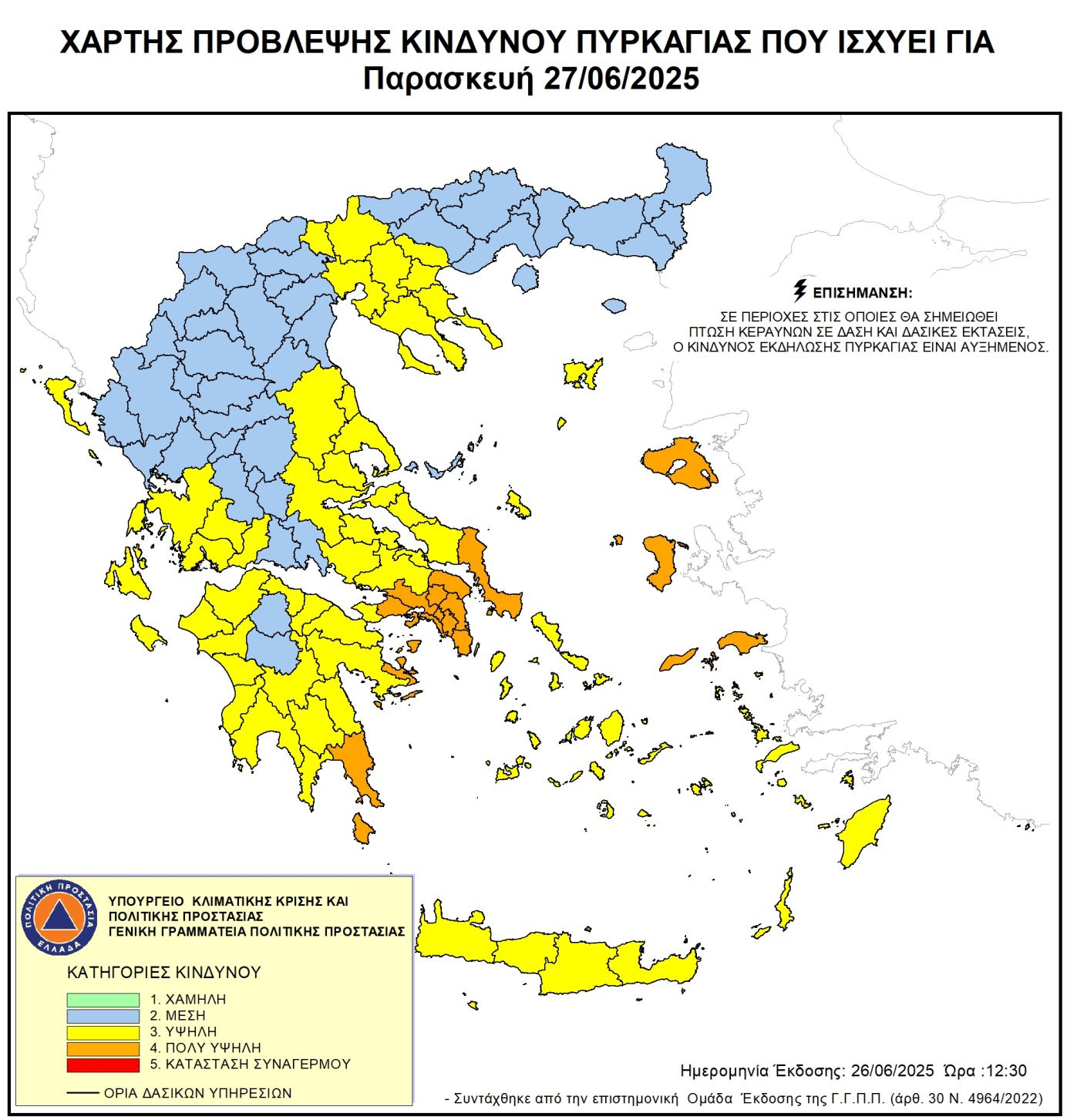 Υψηλός κίνδυνος πυρκαγιάς (κατηγορία κινδύνου 3) στο Δήμο Γορτυνίας, προβλέπεται για αύριο Παρασκευή (27-06-2025), σύμφωνα με τον Ημερήσιο Χάρτη Πρόβλεψης Κινδύνου Πυρκαγιάς, που εκδόθηκε από τη Γενική Γραμματεία Πολιτικής Προστασίας.
