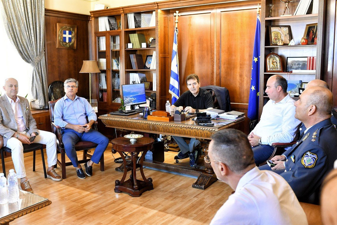 Ακολούθησε συνάντηση του Υπουργού Προστασίας του Πολίτη με τον Δήμαρχο Κορινθίων, Νικόλαο Σταυρέλη, ο οποίος του έθεσε τα ζητήματα ασφαλείας που απασχολούν τον Δήμο. Στη συνέχεια ο κ. Χρυσοχοΐδης επισκέφθηκε τον Αντιπεριφερειάρχη Κορινθίας, Αναστάσιο Γκιολή και ακολούθησε σύσκεψη παρουσία των Δημάρχων του Νομού, Λουτρακίου Περαχώρας & Αγίων Θεοδώρων, Βέλου Βόχας, Συκυωνίων, Ξυλοκάστρου Ευρωστίνης, Νεμέας, όπως και των Ανώτατων Αξιωματικών της ΕΛ.ΑΣ.